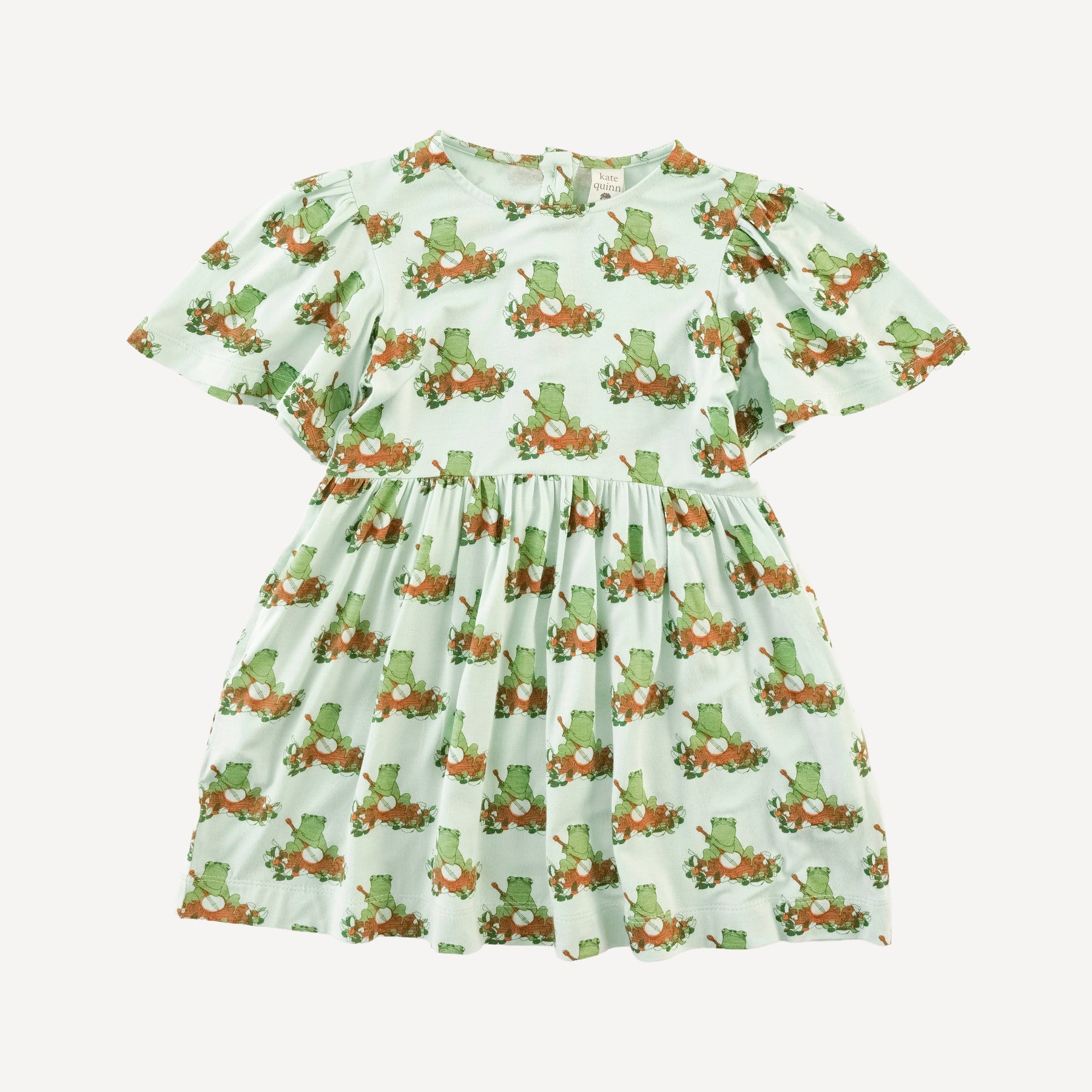Features bell sleeves, gathered waist, side seam pockets, and back button placket.