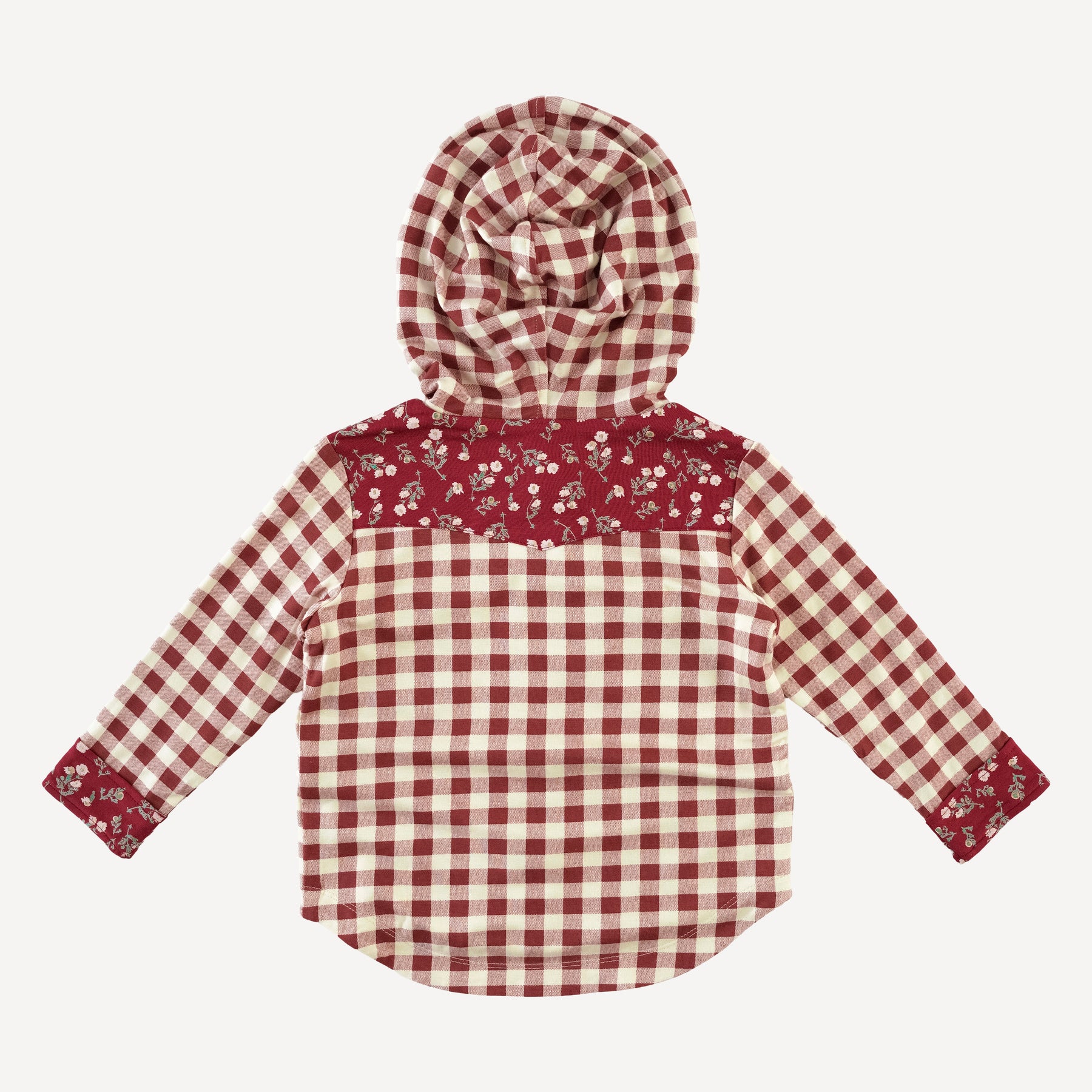 Features lined hood, front button-down placket, front button pockets, and contrasting yoke, pocket flaps, cuff detailing, and lining.