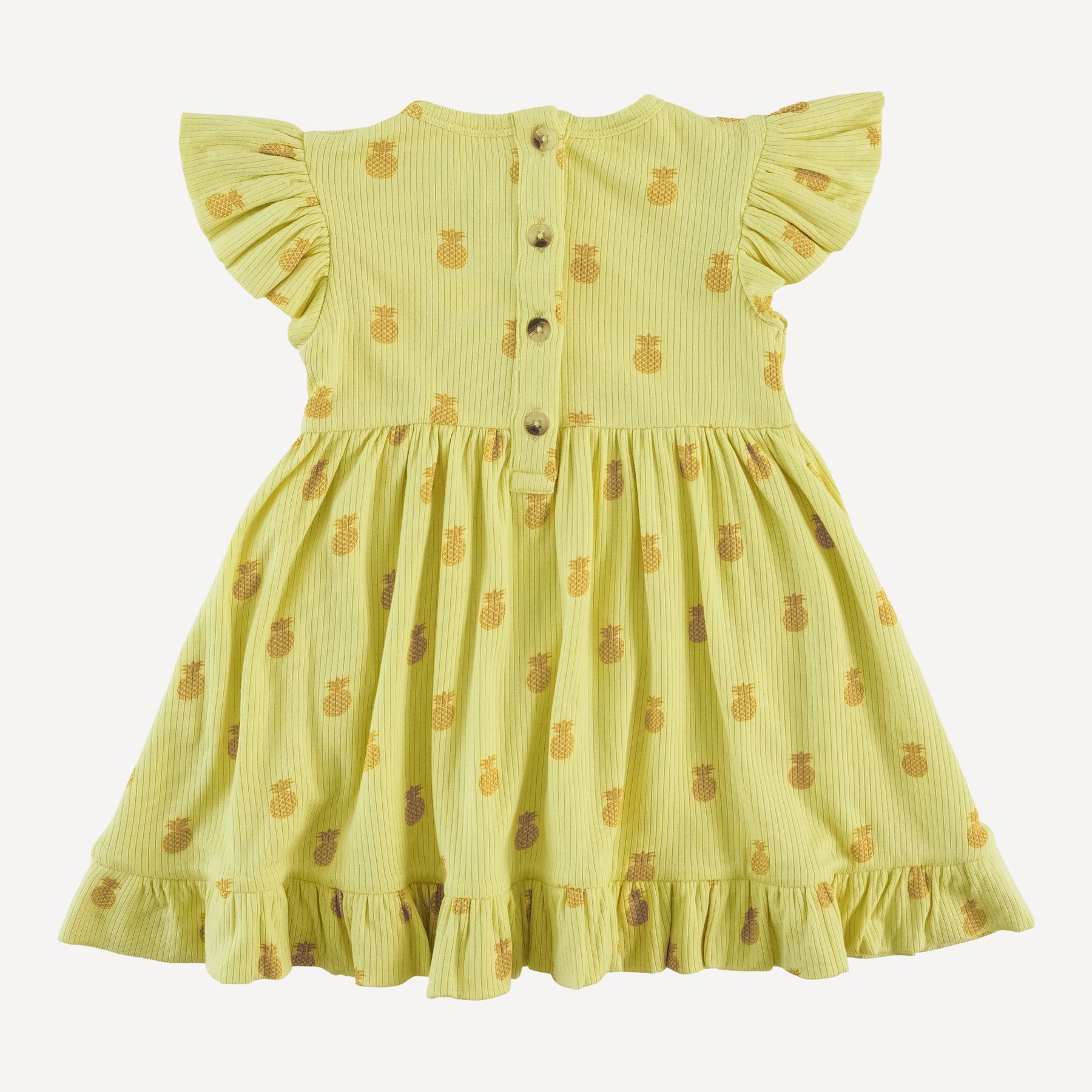 Features flutter sleeves, gathered waist, ruffle hem, back button placket and side seam pockets.