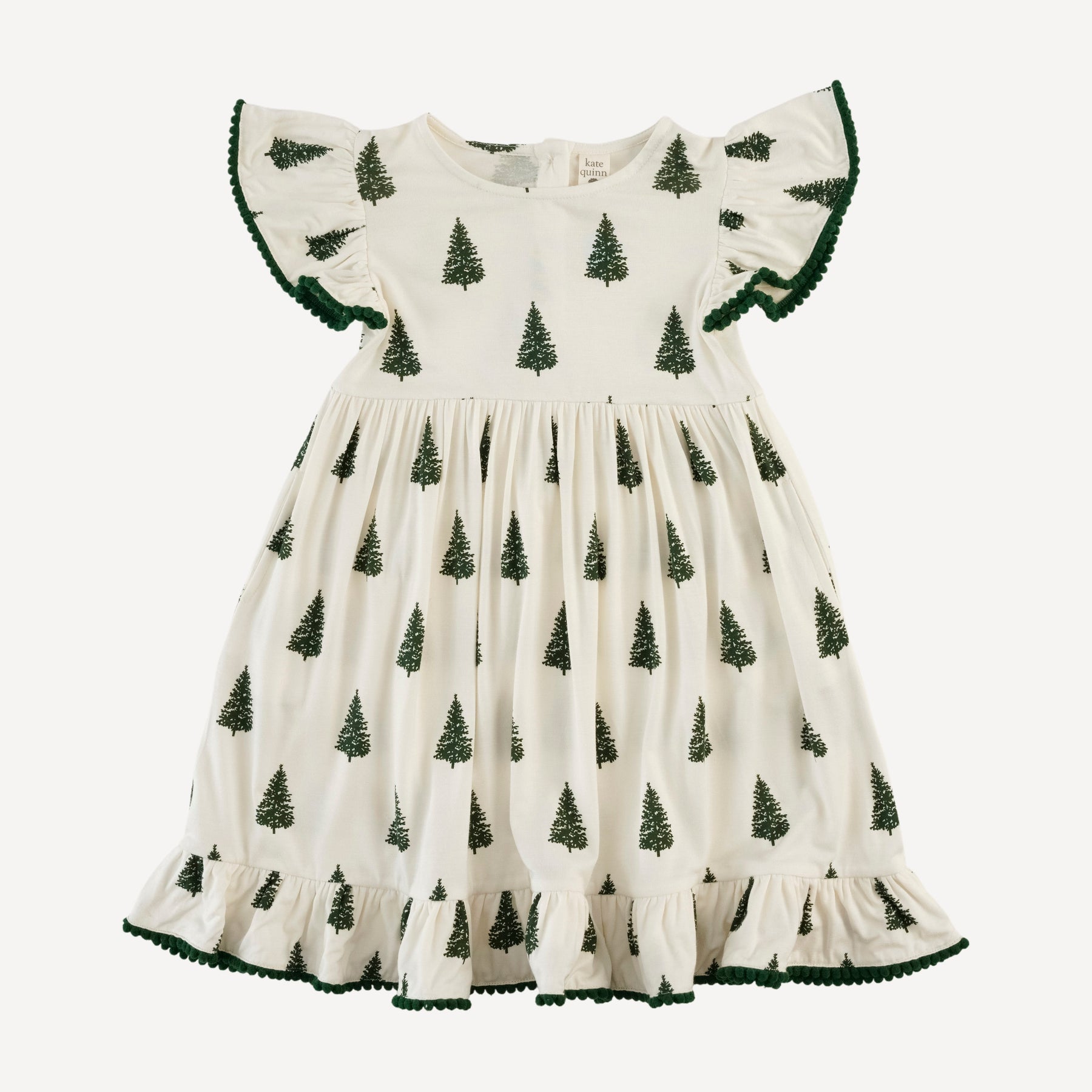 flutter sleeve pom pom pinafore dress | mountain pine | bamboo