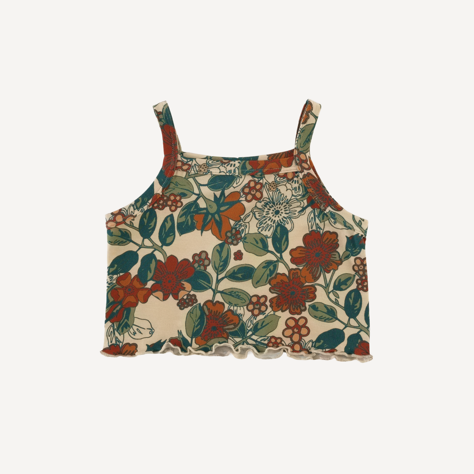 Features a cropped tank with spaghetti straps and lettuce hem paired with matching shorts with elastic waistband, gathered details, and lettuce hem.