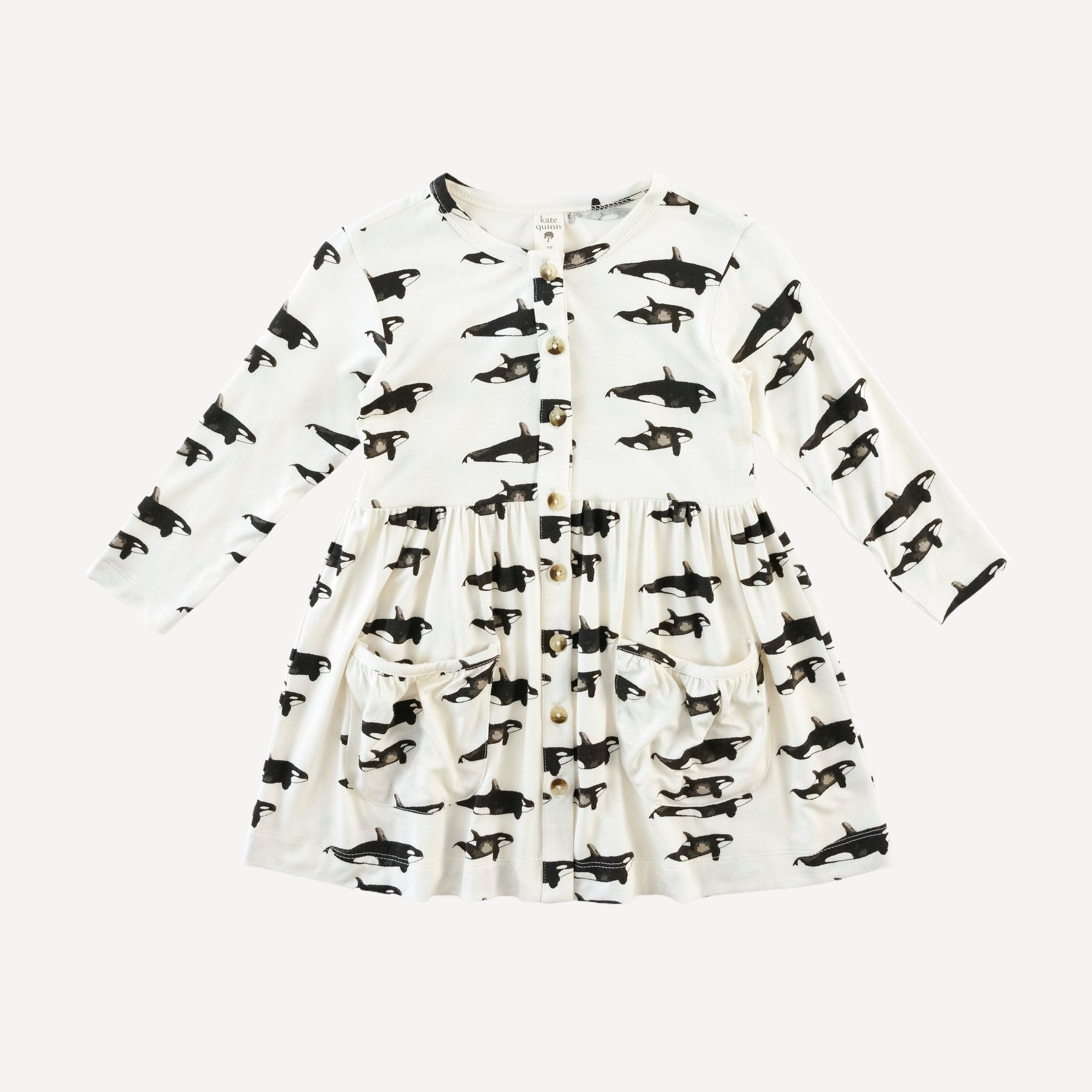 Features front button-down placket, gathered waist, and front pockets.