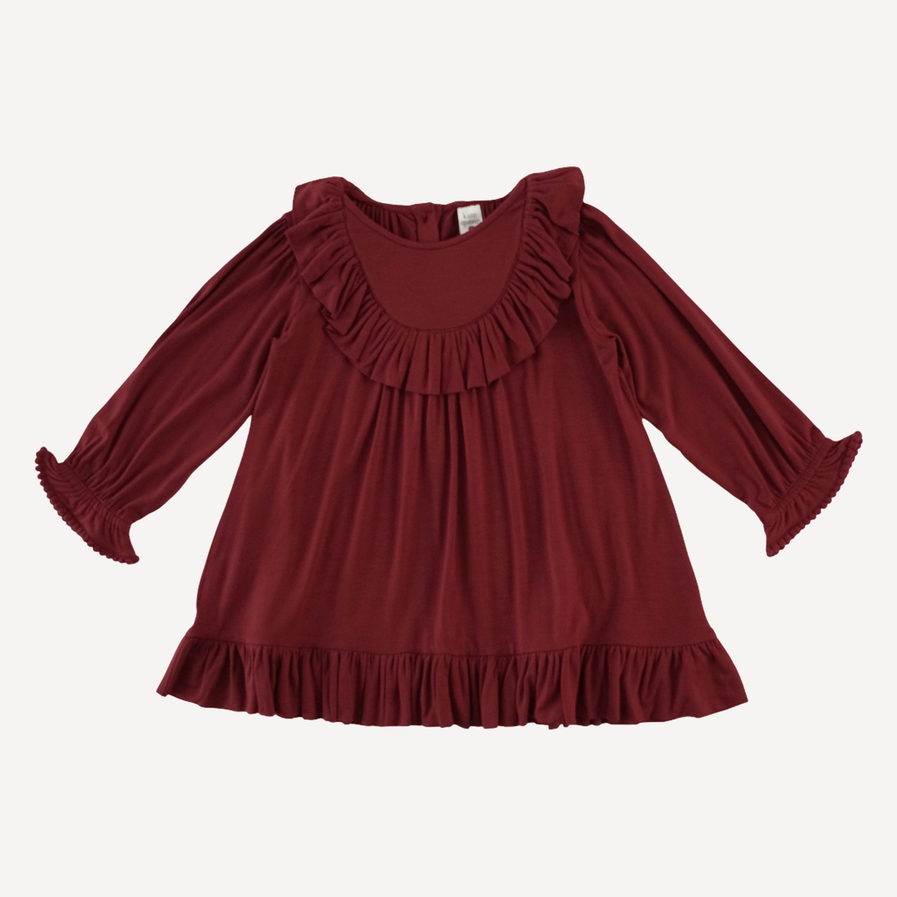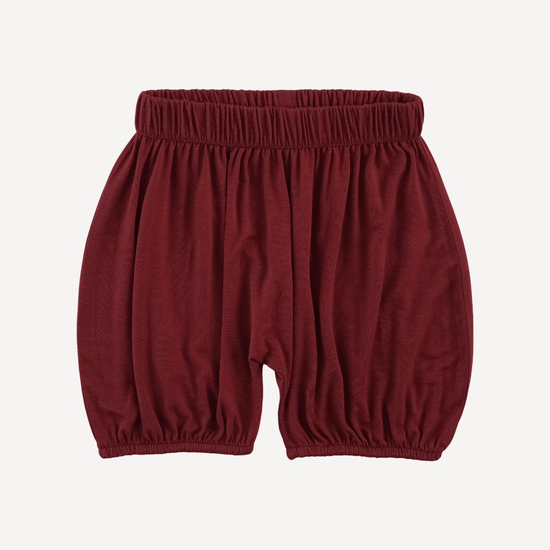 Features a dress with a ruffle yoke, gathered details, gathered sleeves with pom pom trim, back button placket, and a ruffle hem paired with matching gathered bloomer shorts.