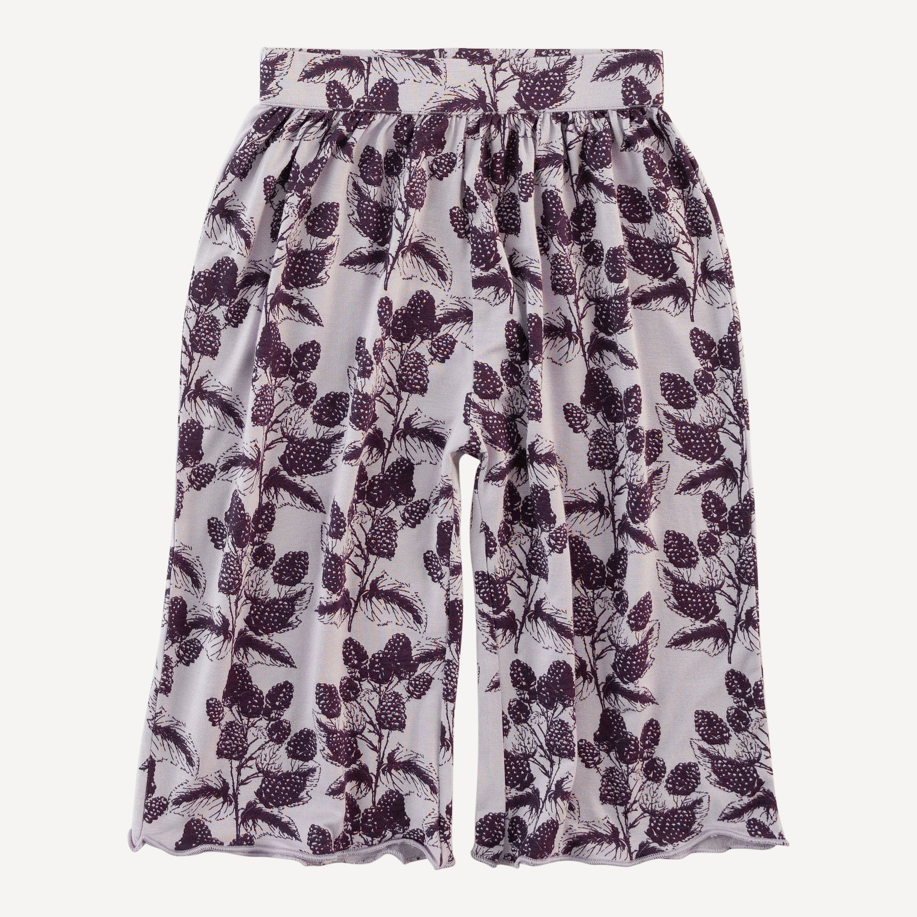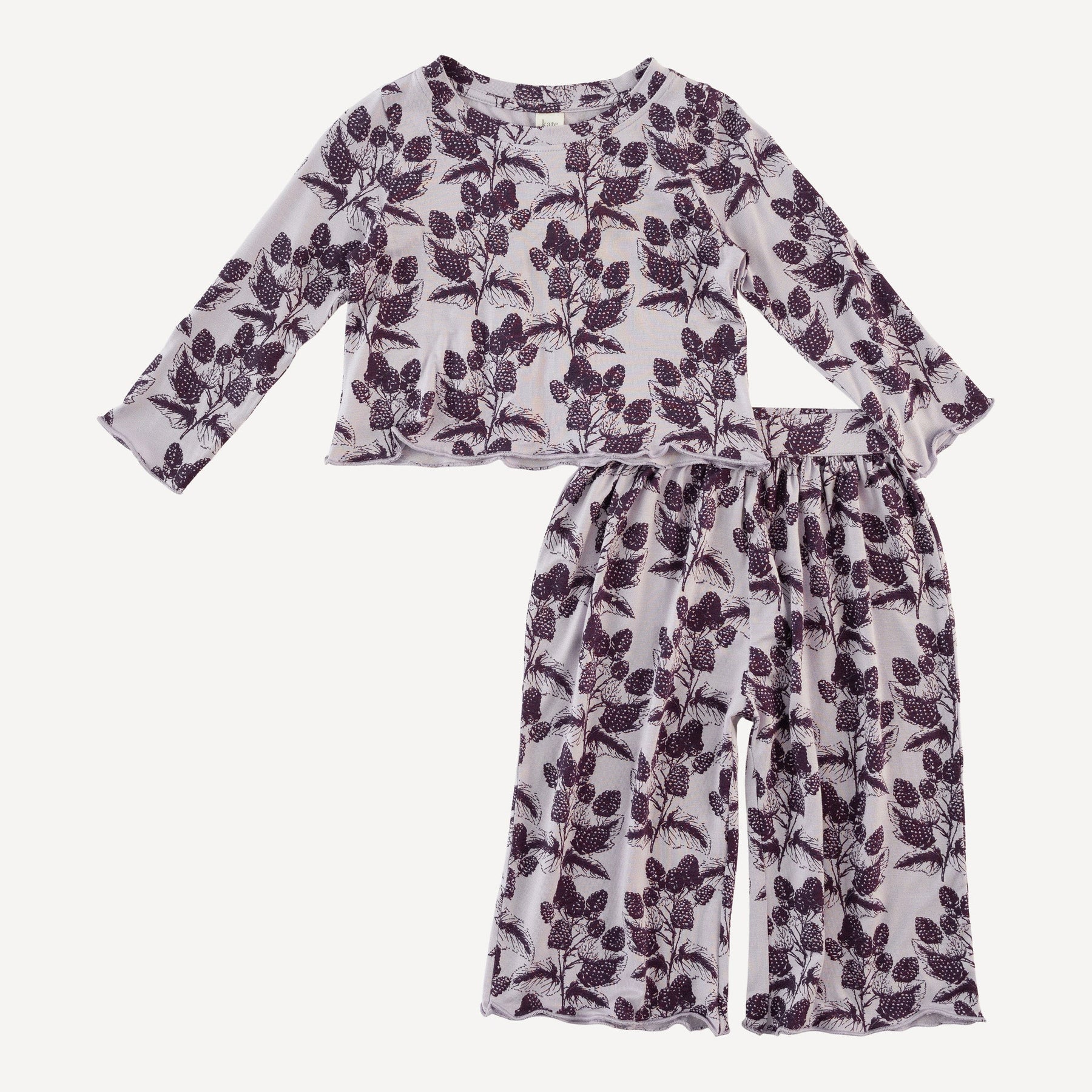 Features a cropped top with lettuce hem paired with matching cropped gaucho pants with elastic waistband, gathered details, and lettuce hem.