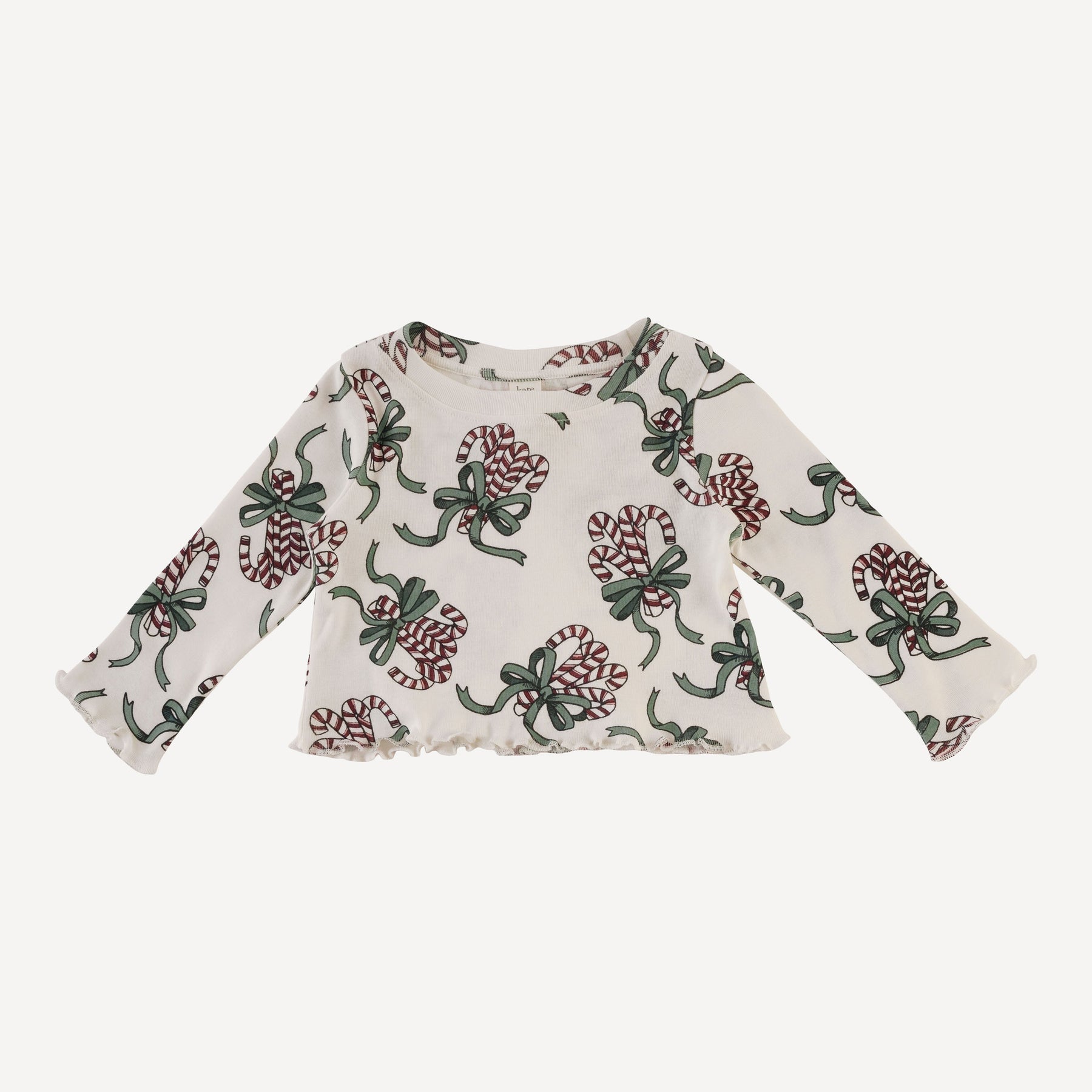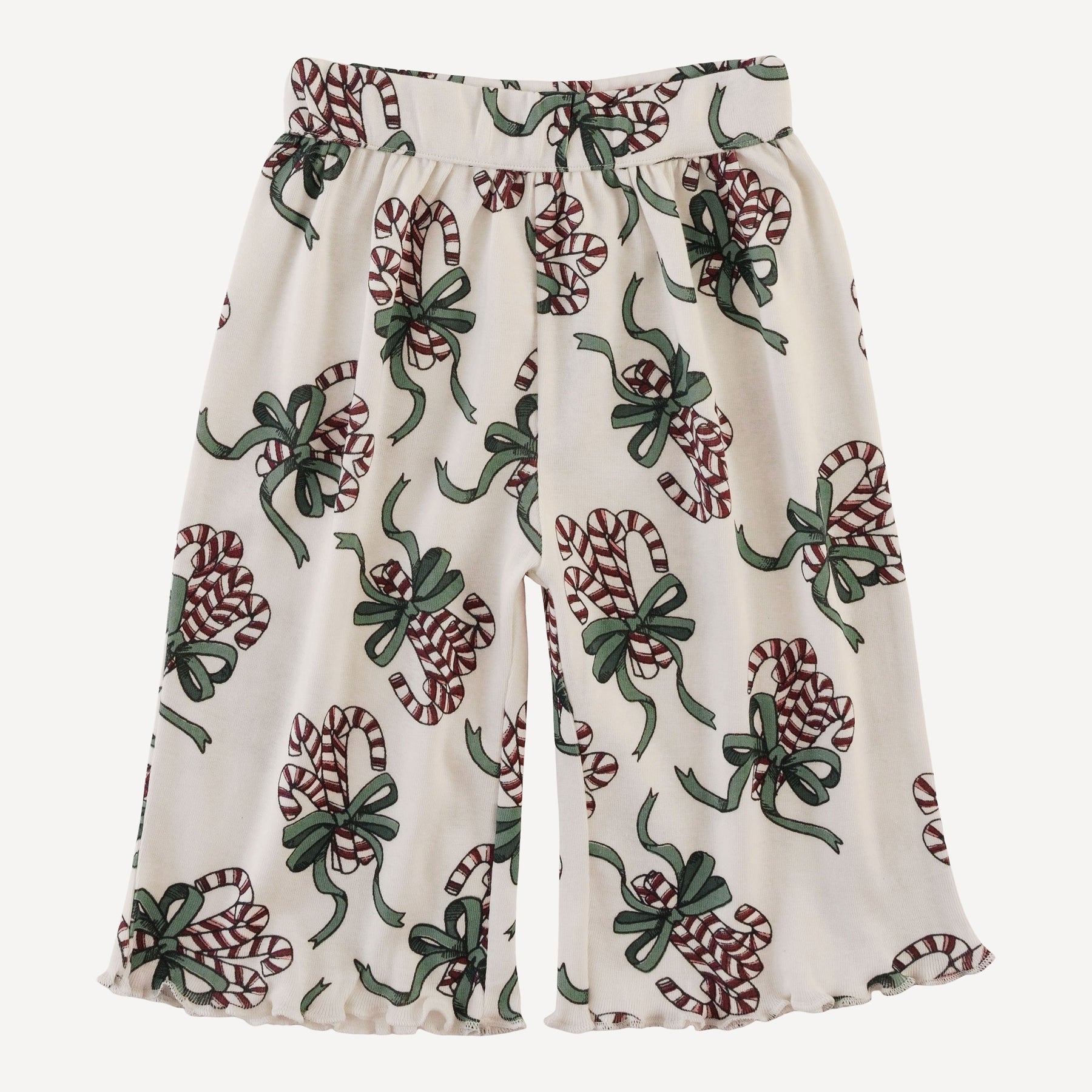 Features a cropped top with lettuce hem paired with matching cropped gaucho pants with elastic waistband, gathered details, and lettuce hem.