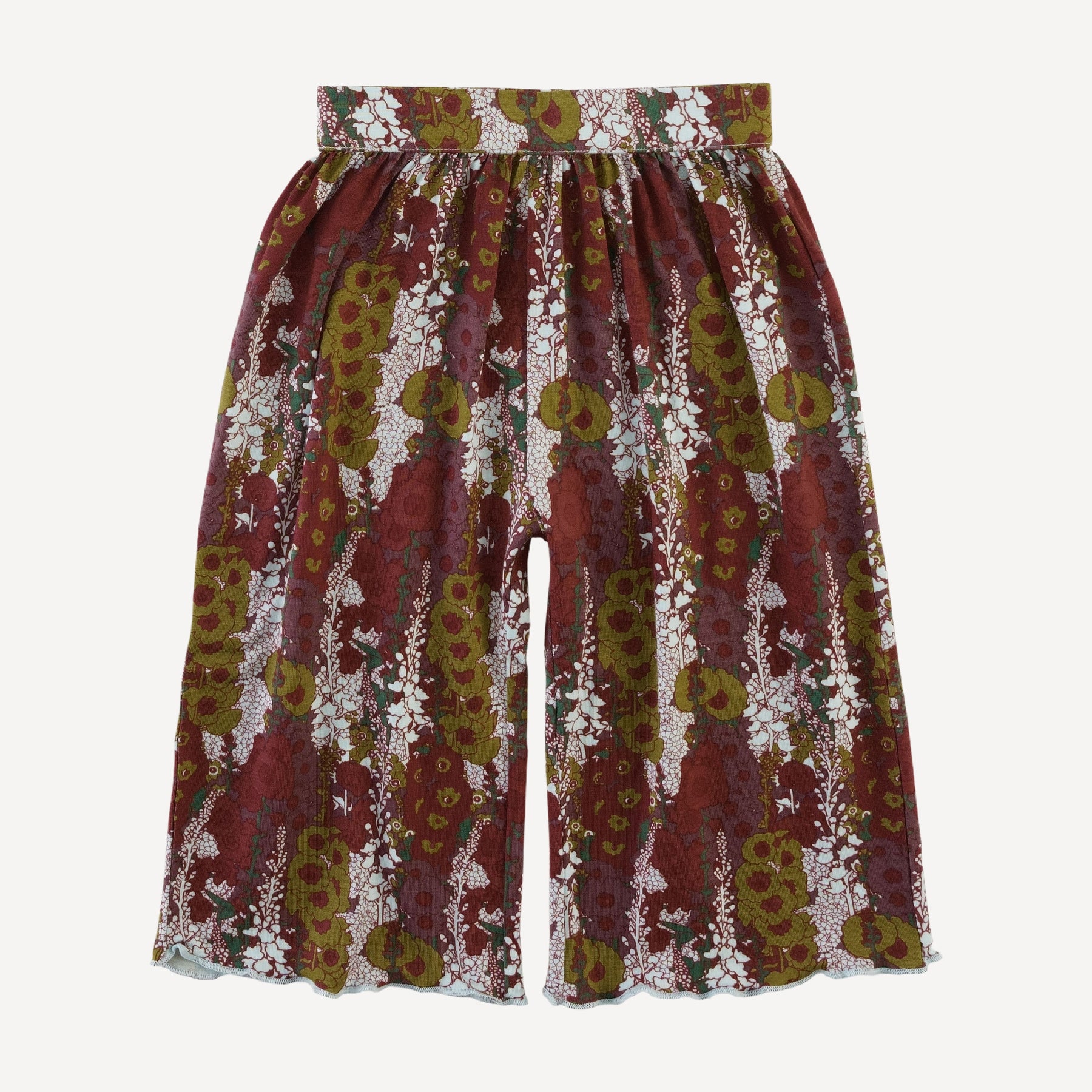 Features a cropped top with lettuce hem paired with matching cropped gaucho pants with elastic waistband, gathered details, and lettuce hem.