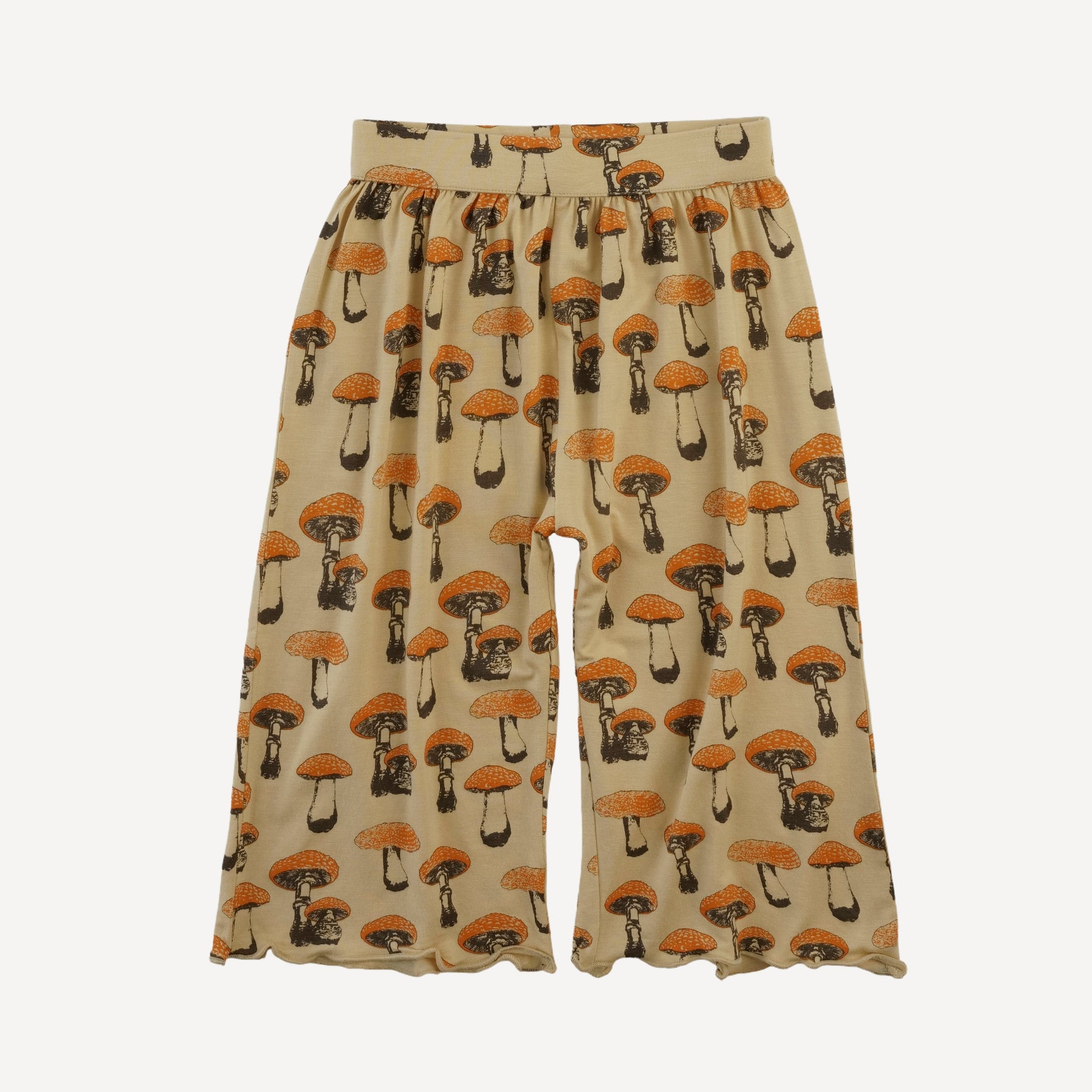 Features a cropped top with lettuce hem paired with matching cropped gaucho pants with elastic waistband, gathered details, and lettuce hem.