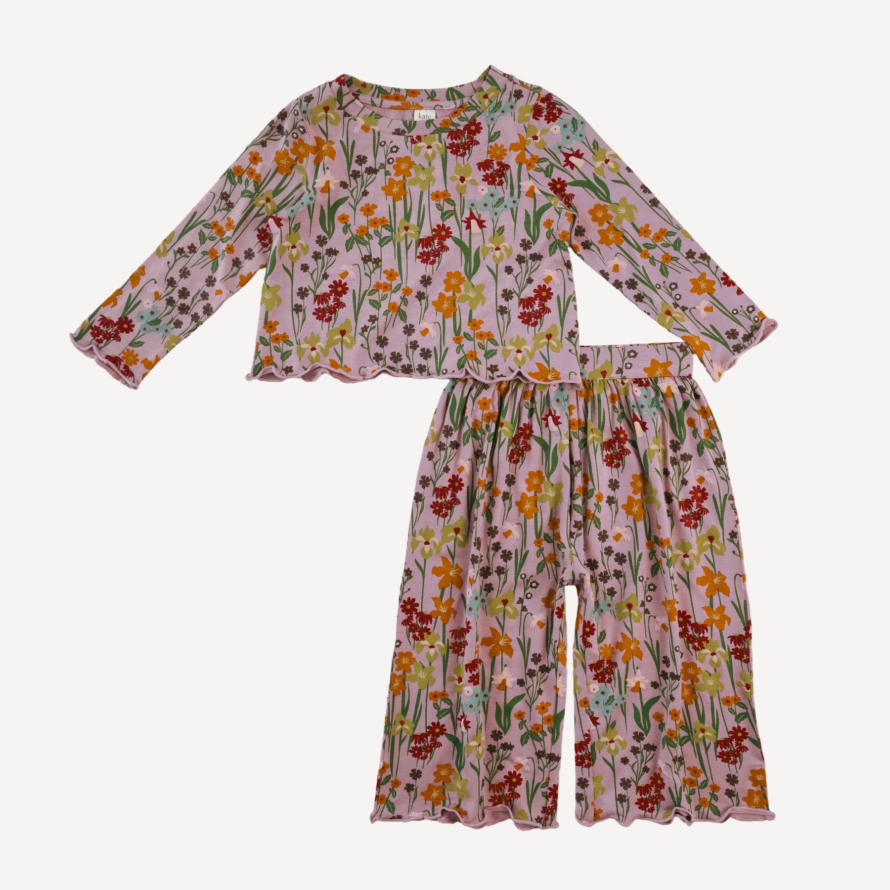Features a cropped top with lettuce hem paired with matching cropped gaucho pants with elastic waistband, gathered details, and lettuce hem.