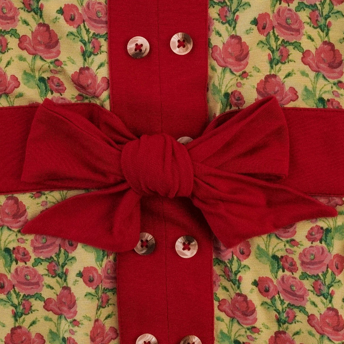 Features v-neckline, puff sleeves, decorative front buttons, belted waistband, self-tie front bow, side pockets, back zipper closure, and contrasting trim details.