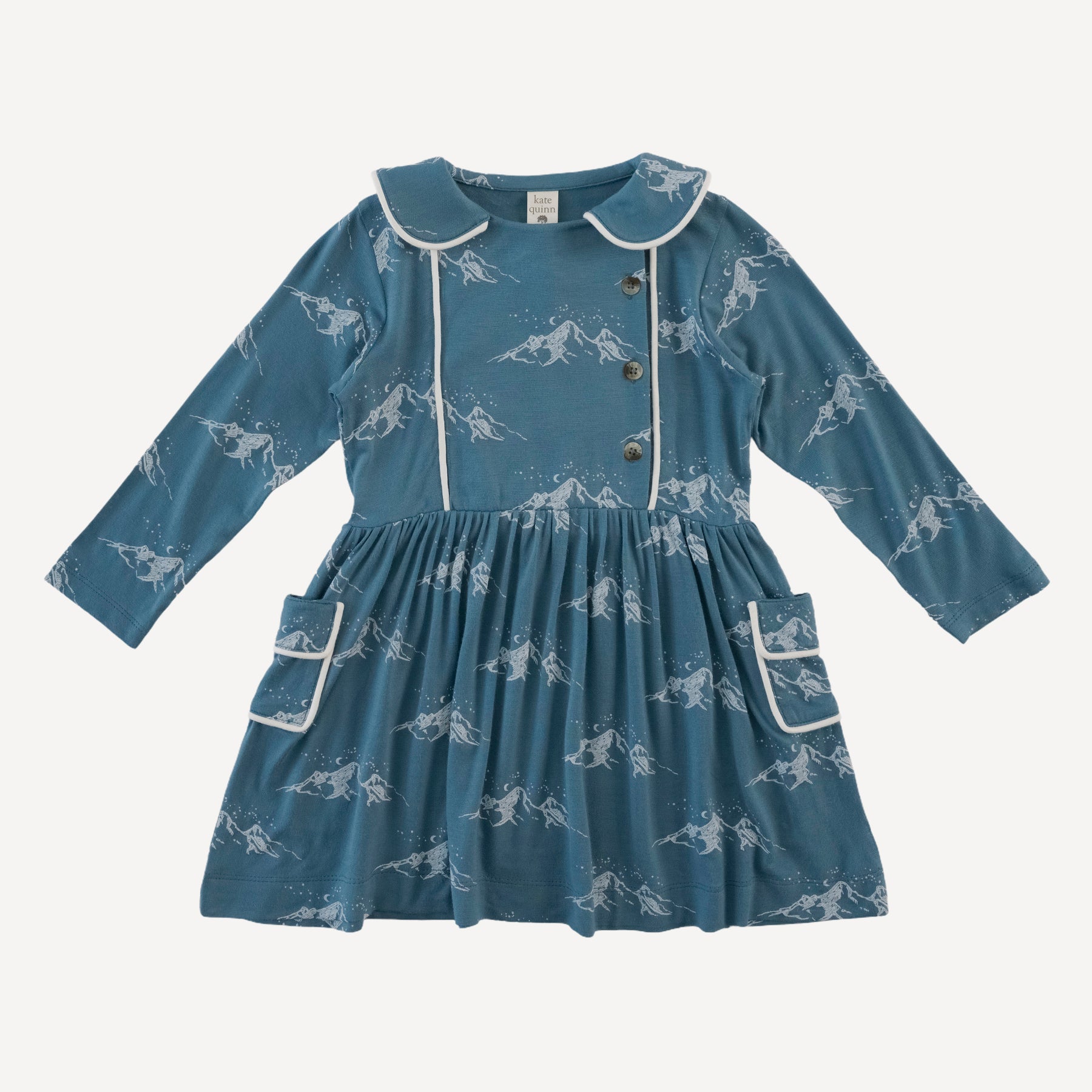 Features peter pan collar, front side button placket, gathered waist, side pockets, and contrasting piping details.