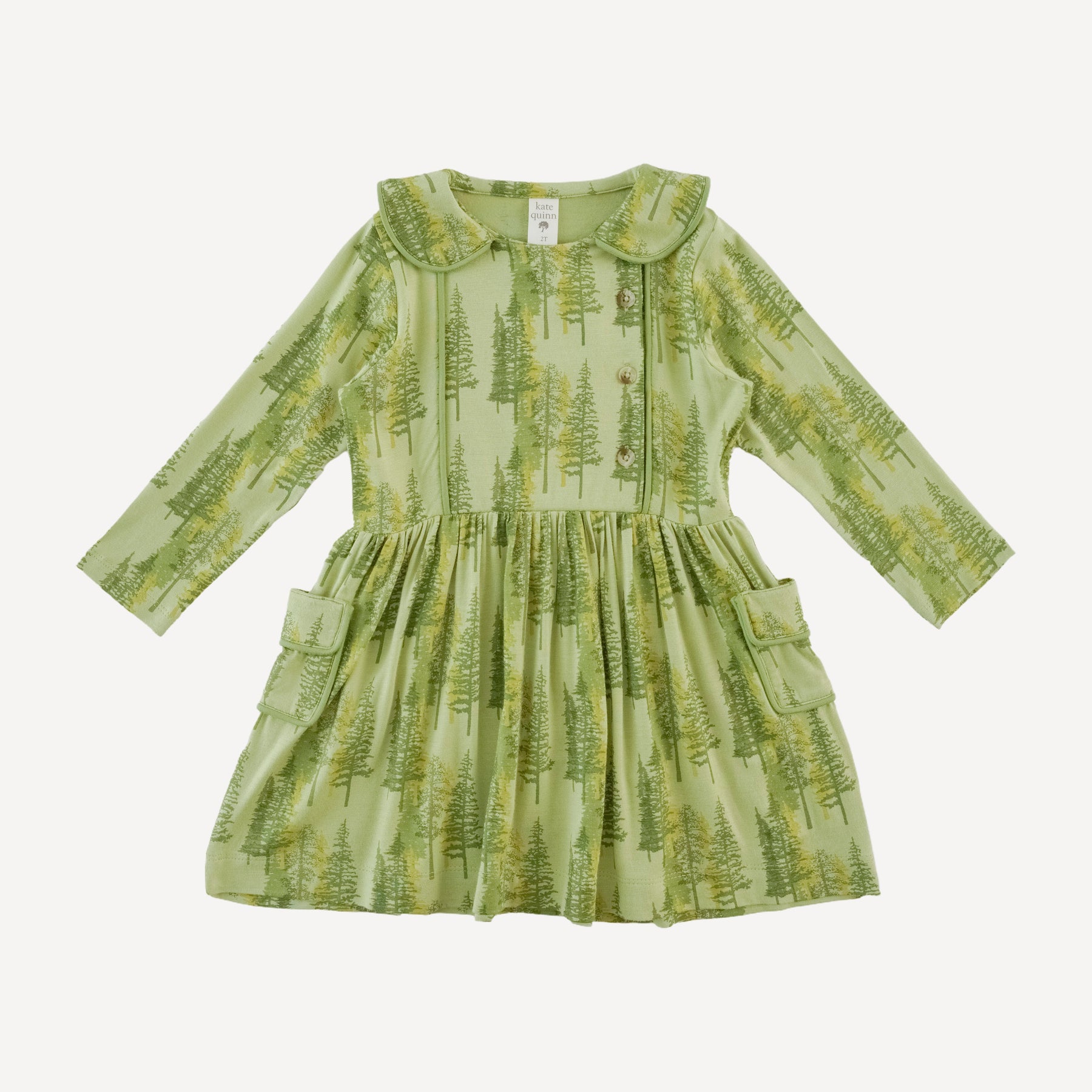Features peter pan collar, front side button placket, gathered waist, side pockets, and contrasting piping details.