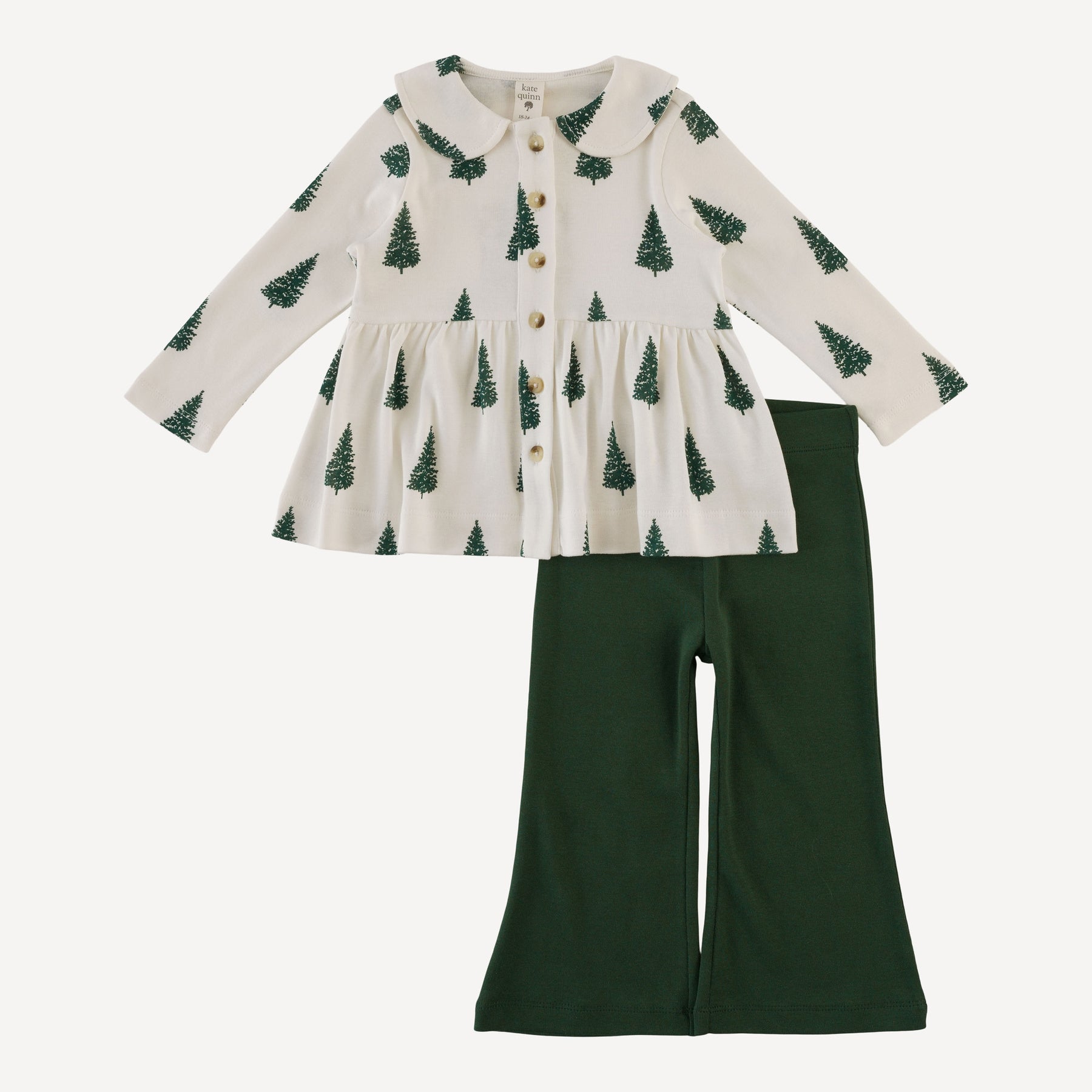 Features a top with a peter pan collar, front button-down placket, and gathered waist paired with contrasting flare leg pants with elastic waistband.