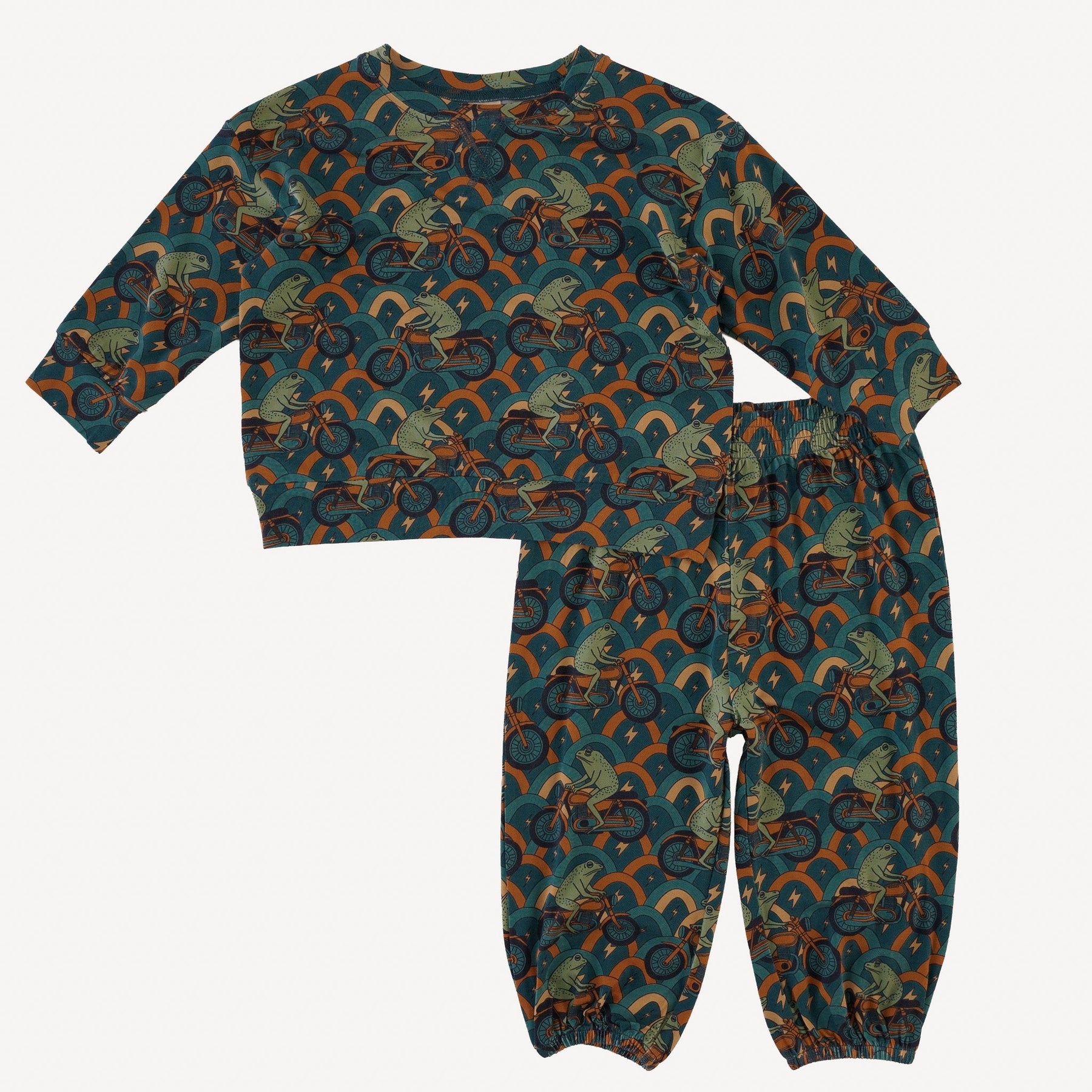 Features a relaxed fit tee with topstitch detail paired with matching relaxed fit joggers with elastic waistband.