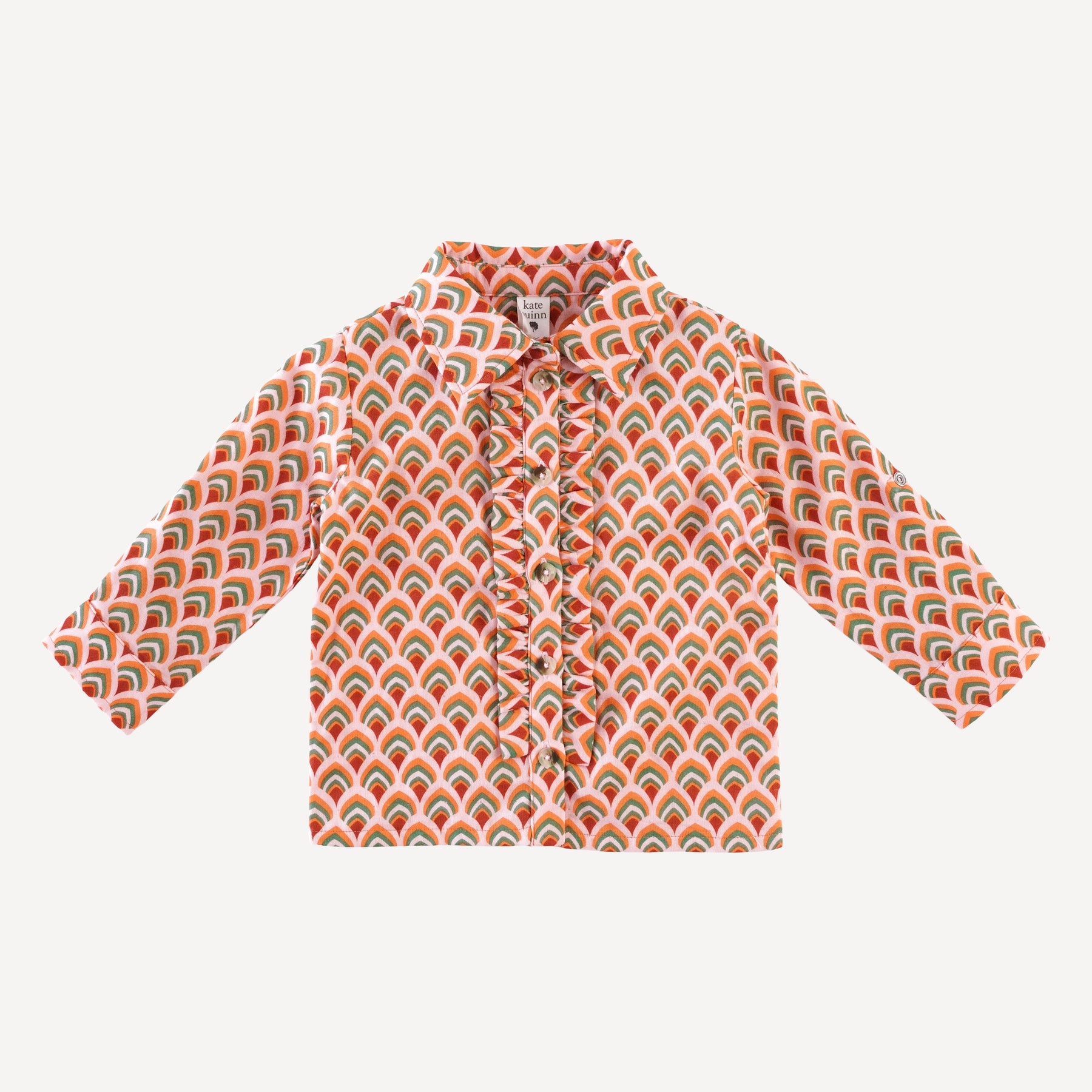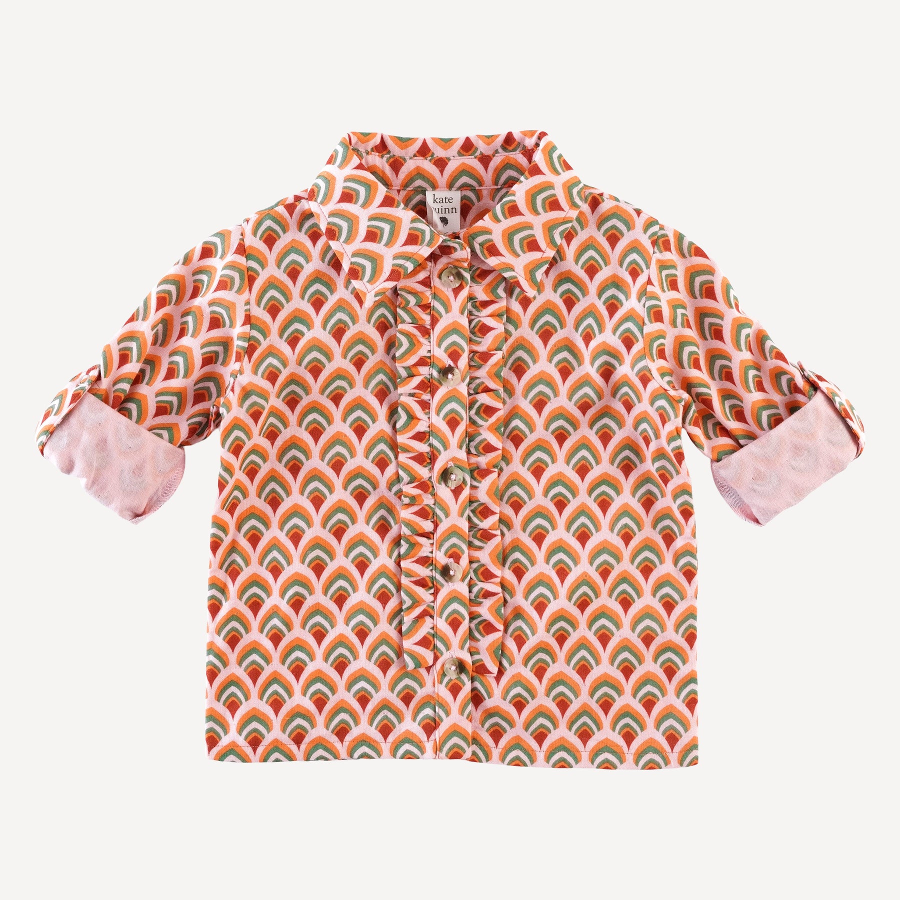 Features collar, front button-down placket with ruffle detailing, and roll-up sleeve tabs.