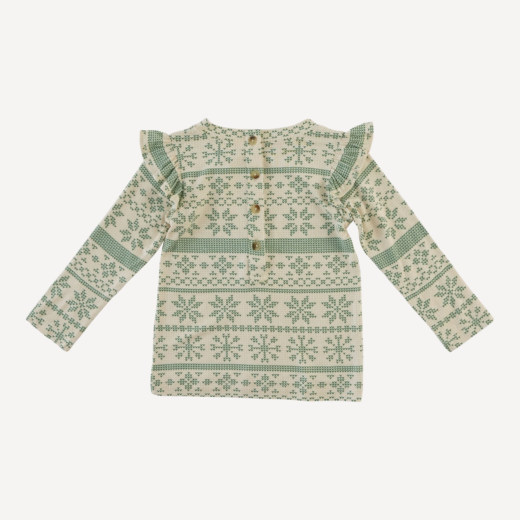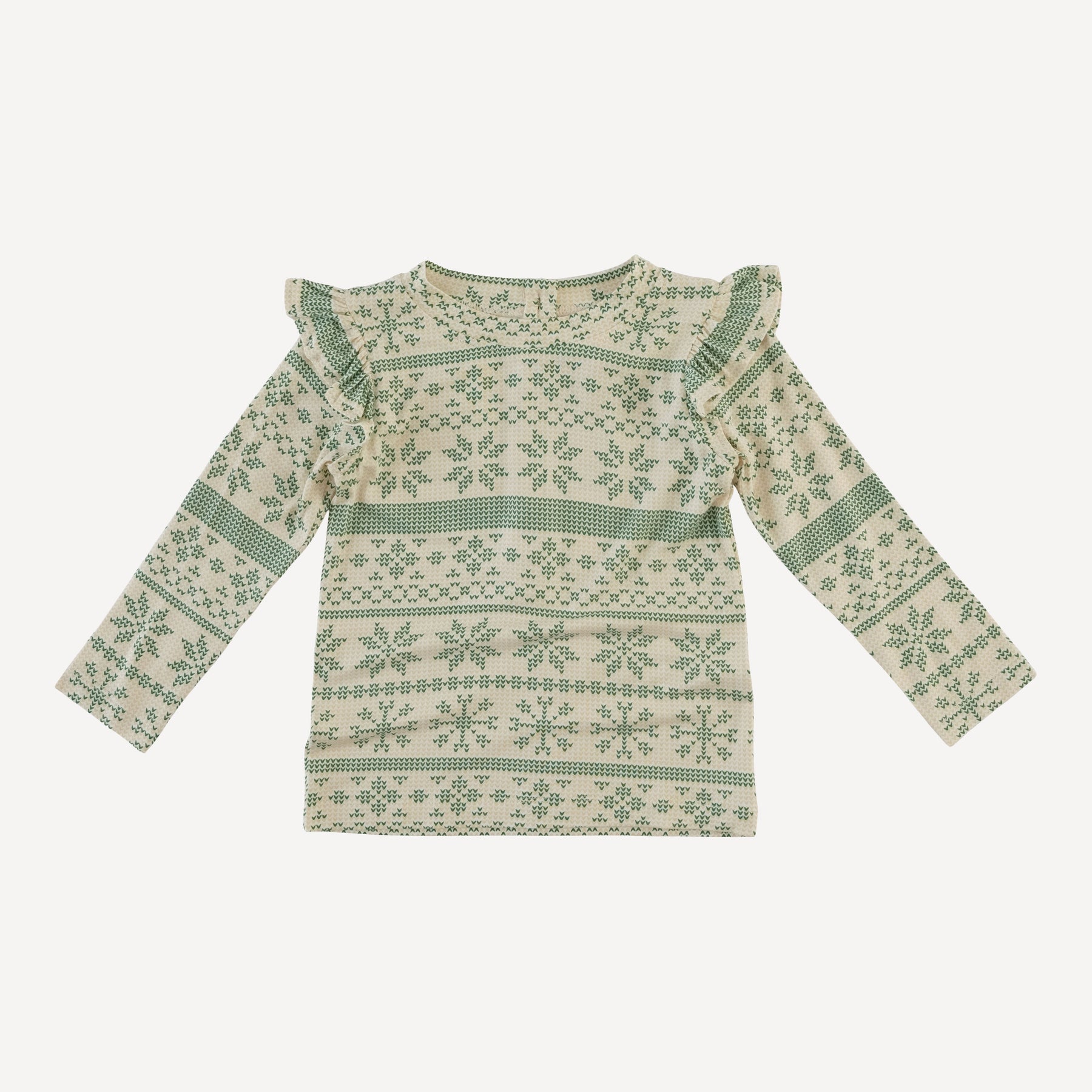 long sleeve shoulder ruffle top | green nordic snowflake | bamboo