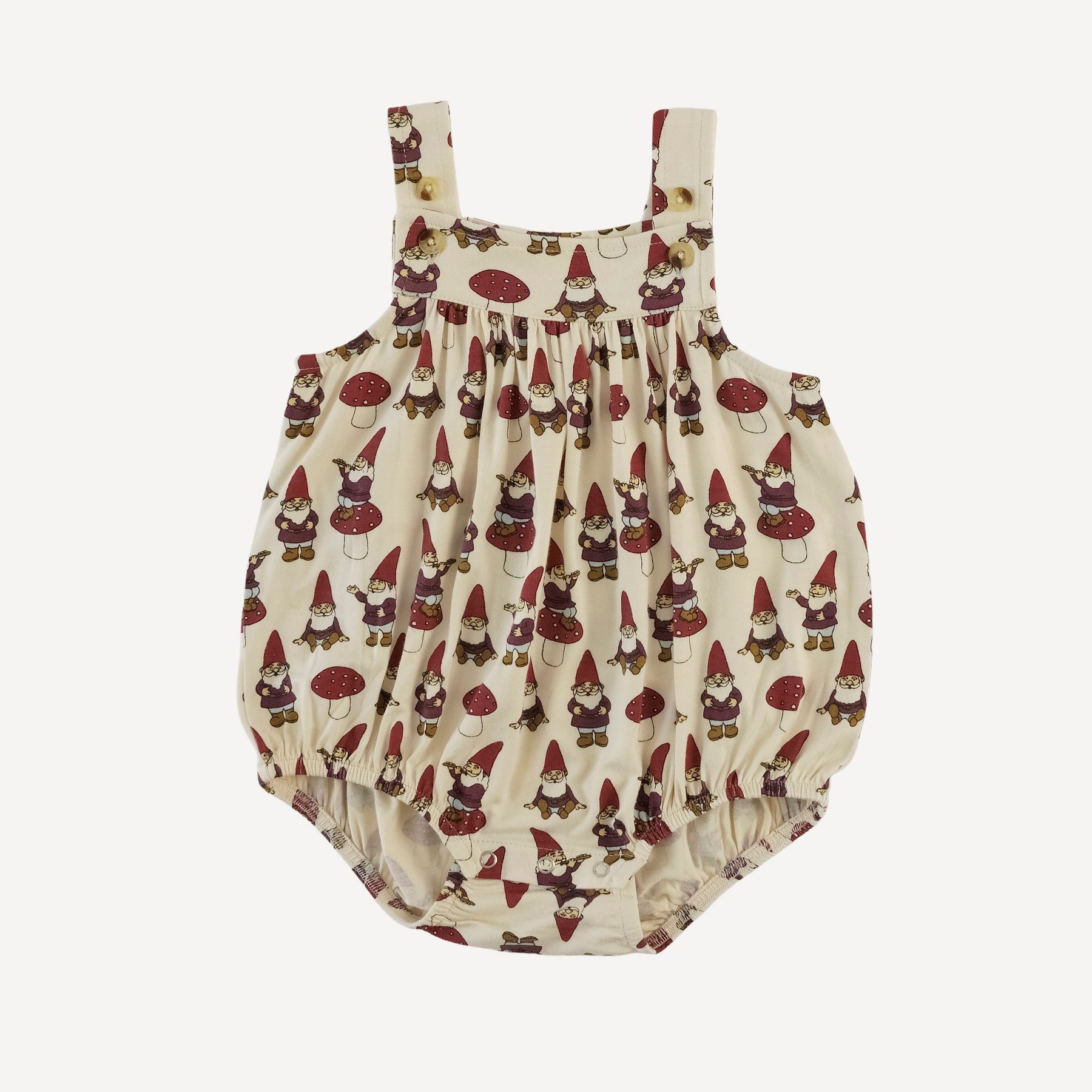 Features adjustable button straps, gathered details, bubble body, and snaps in legs.
