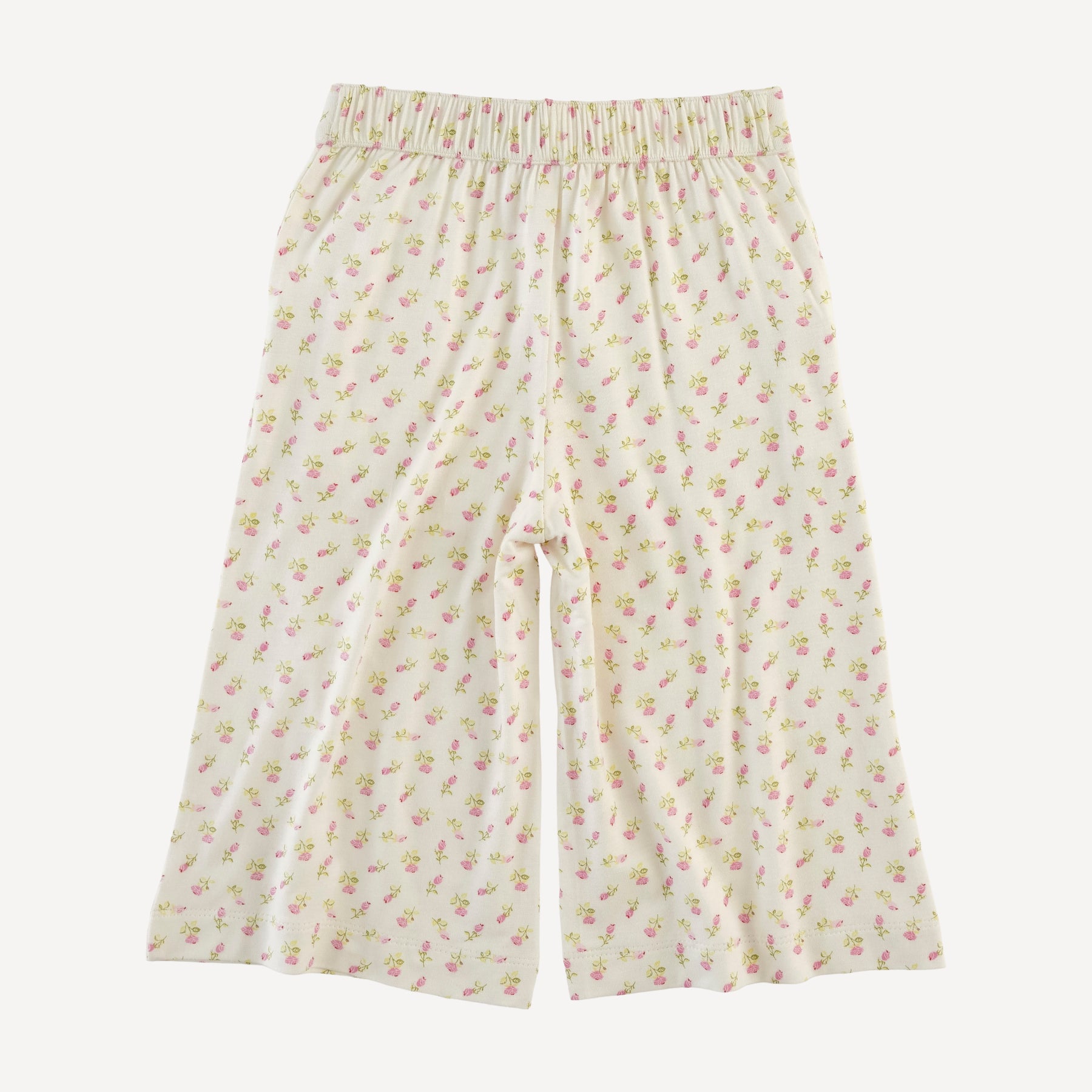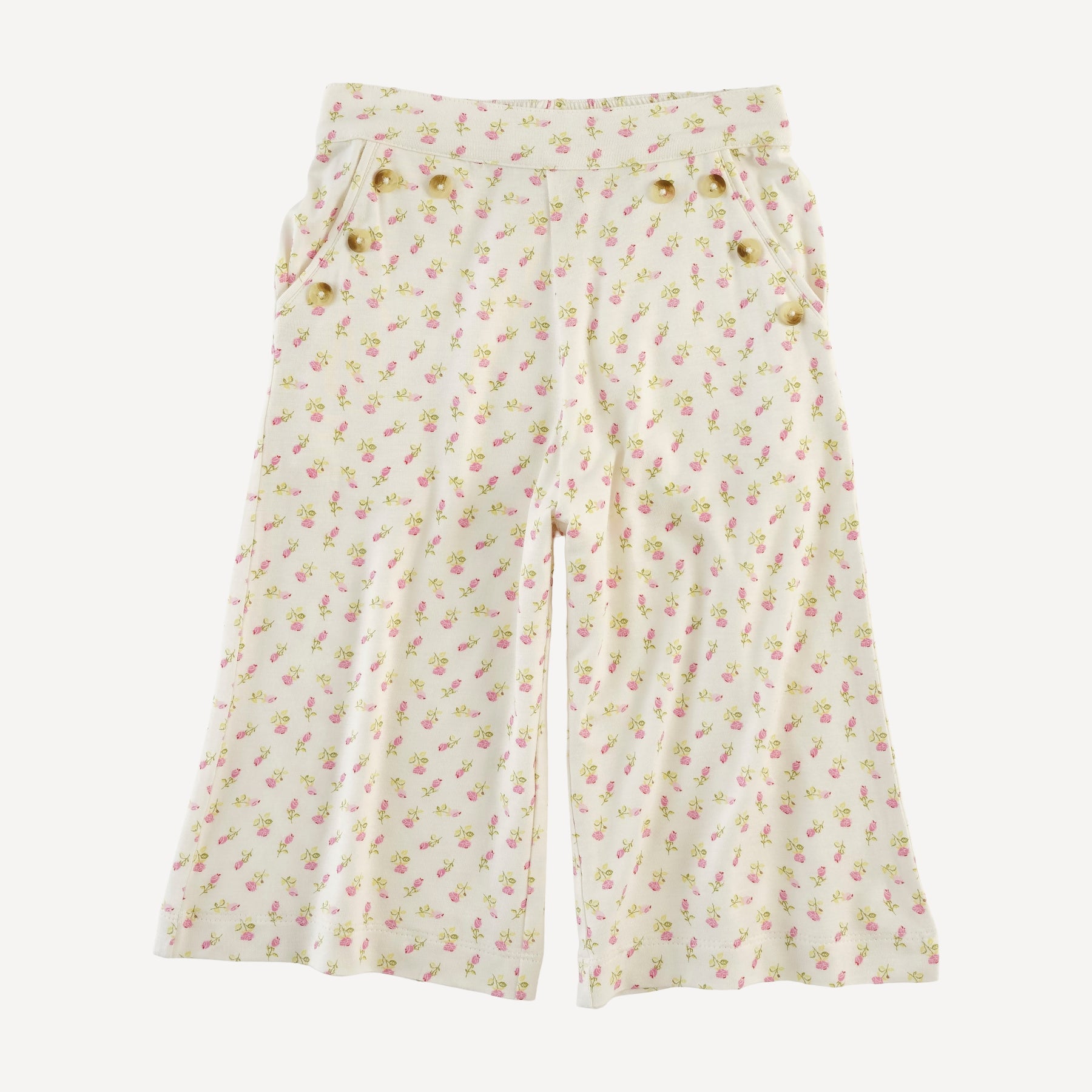 Features front decorative buttons, side pockets with contrasting piped trim, gathered back elastic waistband, and cropped inseam.