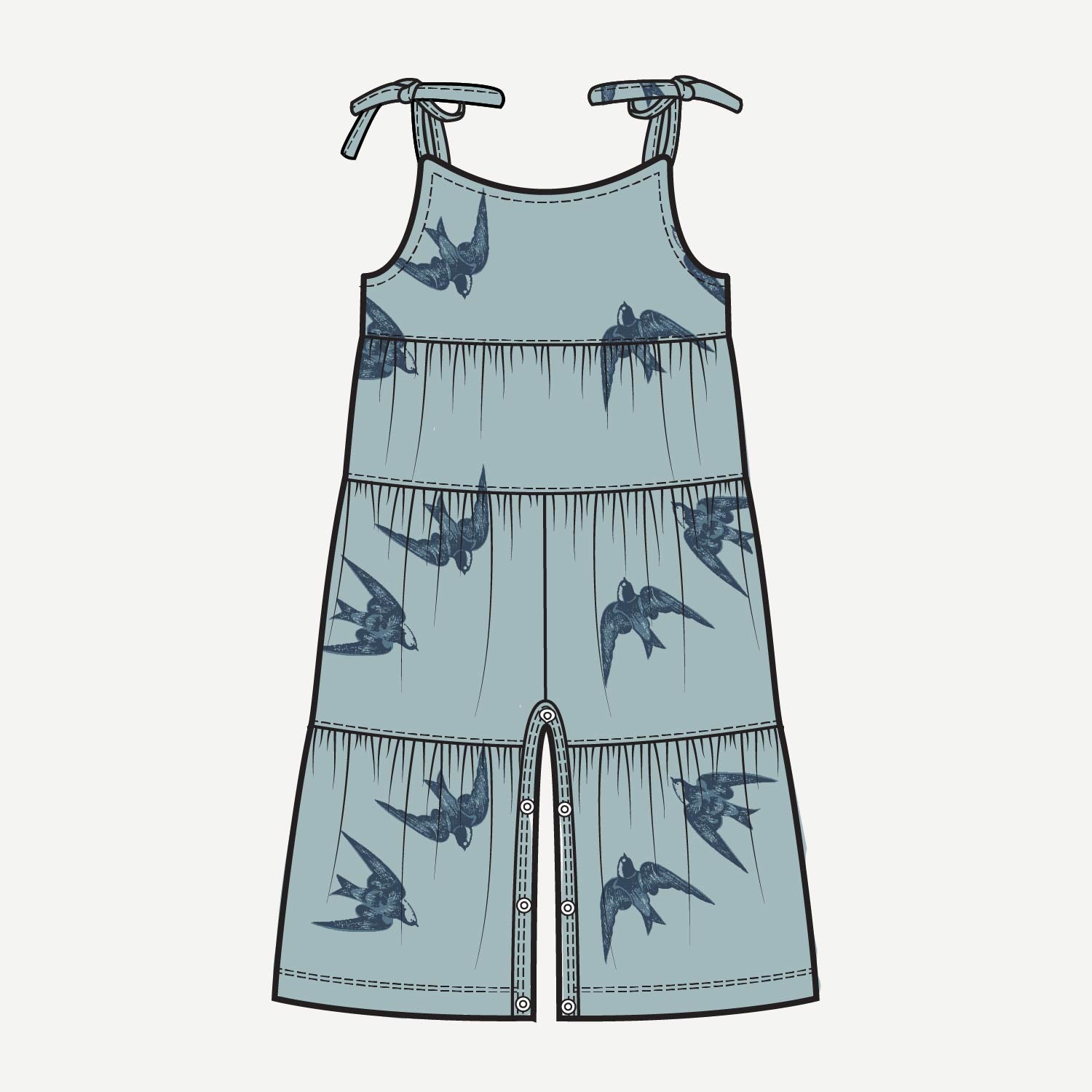 Features self-tie spaghetti straps, gathered tiers, and snaps in legs.