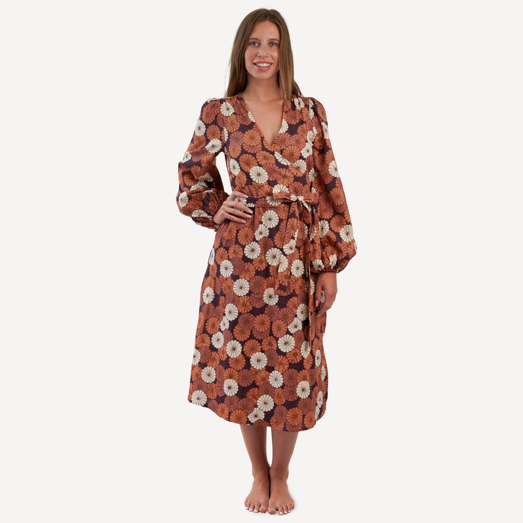 womens balloon sleeve midi wrap dress | vintage daisy | organic cotton gauze