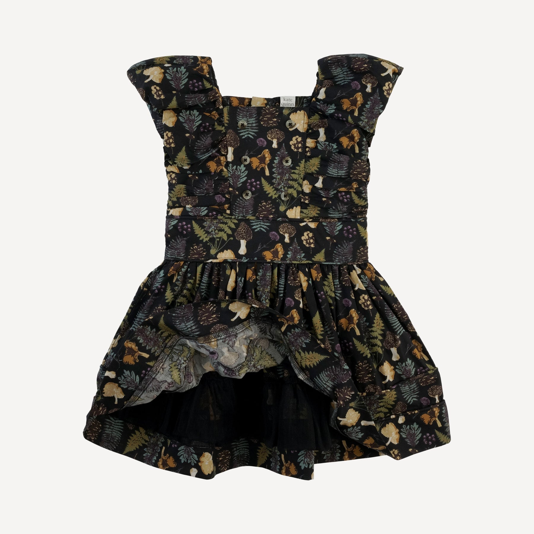 Features bubble ruffle sleeves, decorative front buttons, piping details, back zipper closure with fixed bow detail, and a fully lined skirt with contrasting tulle trim.