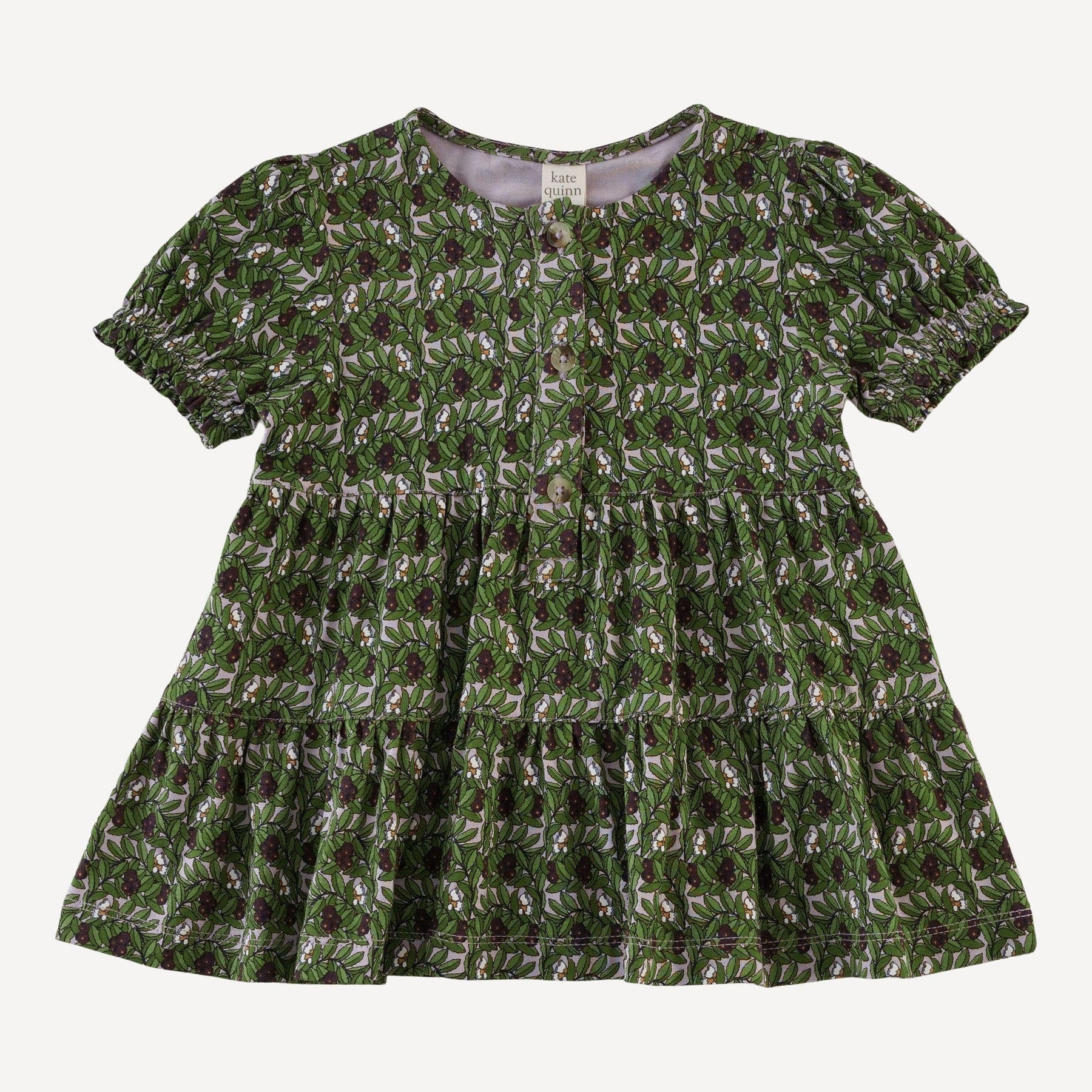 Features a prairie top with short puff sleeves, front button placket, and gathered tiers paired with contrasting classic skinny leggings with elastic waistband.