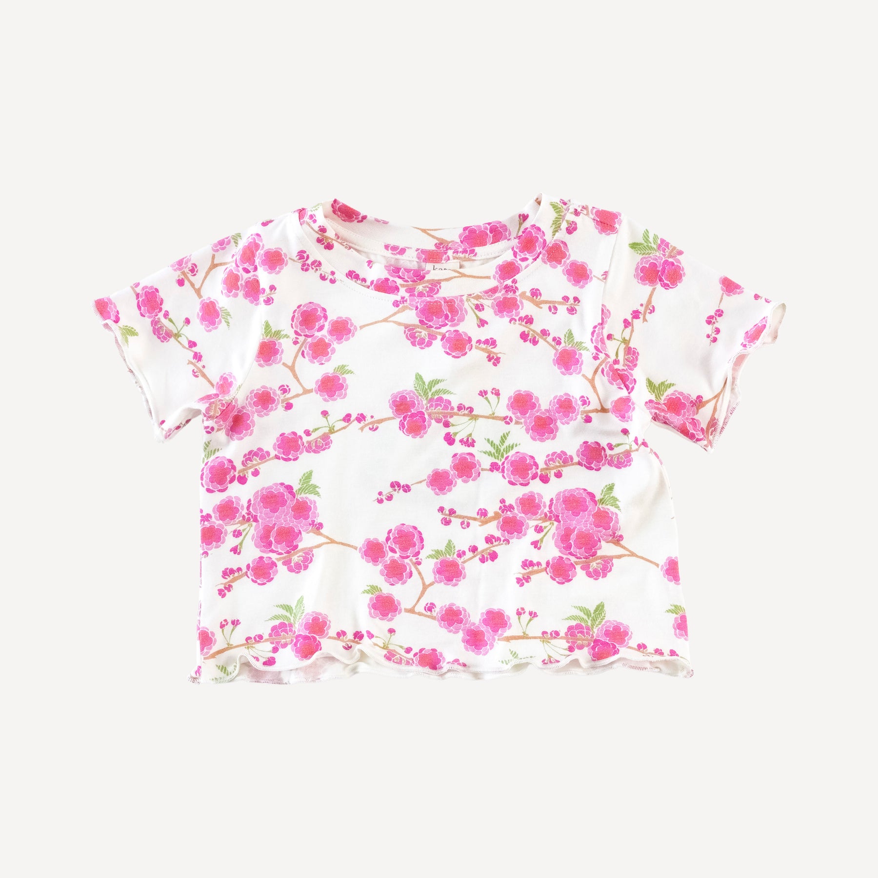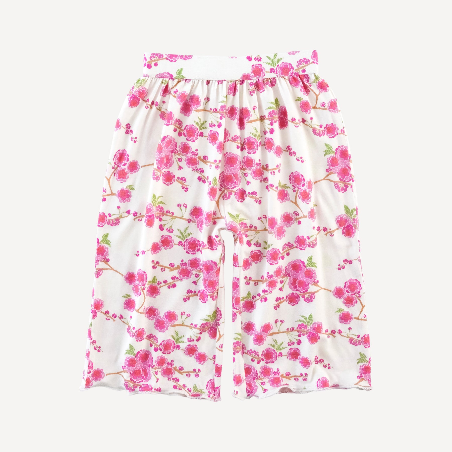 Features a cropped top with lettuce hem paired with matching cropped gaucho pants with elastic waistband, gathered details, and lettuce hem.