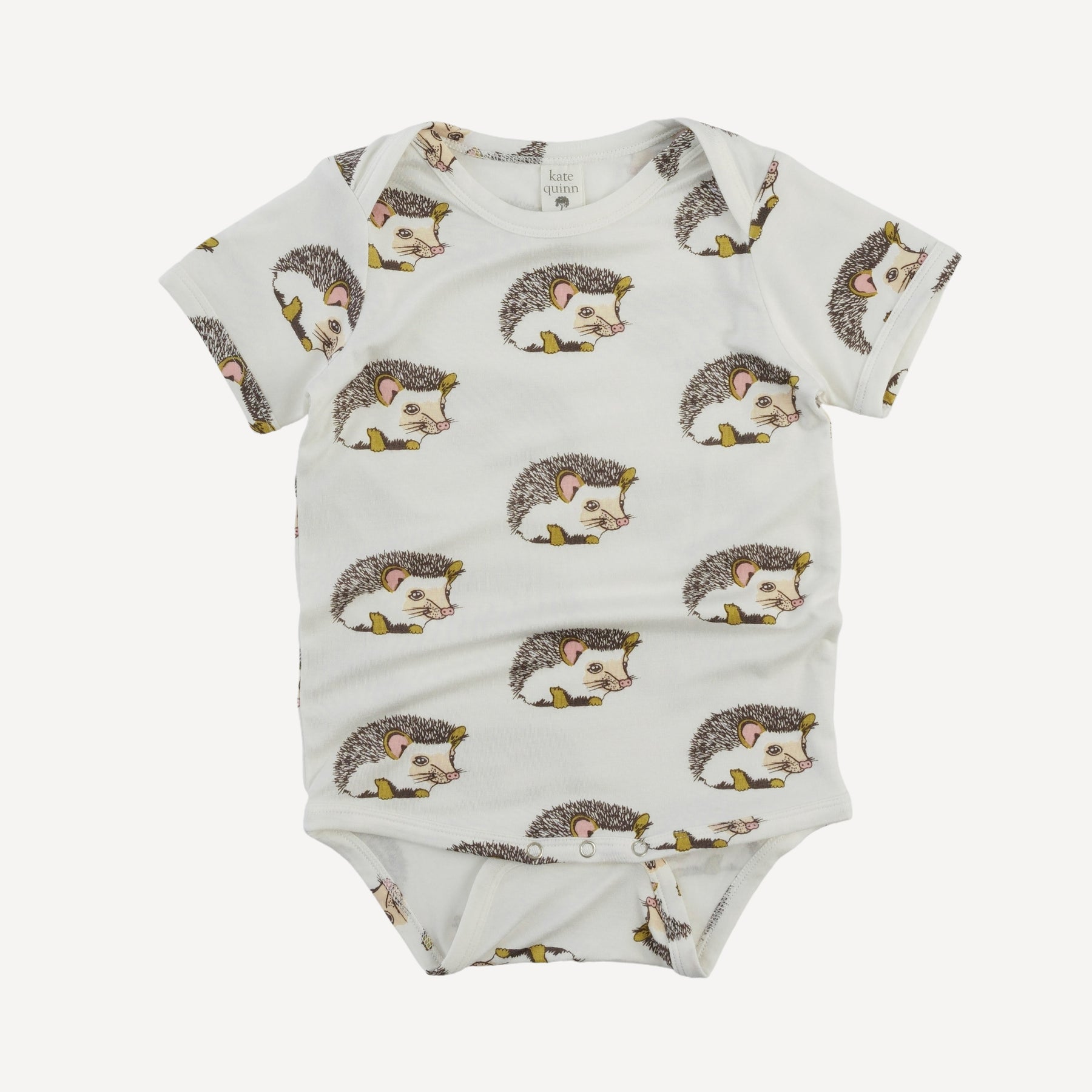 short sleeve lap neck bodysuit | gold hedgehogs | bamboo