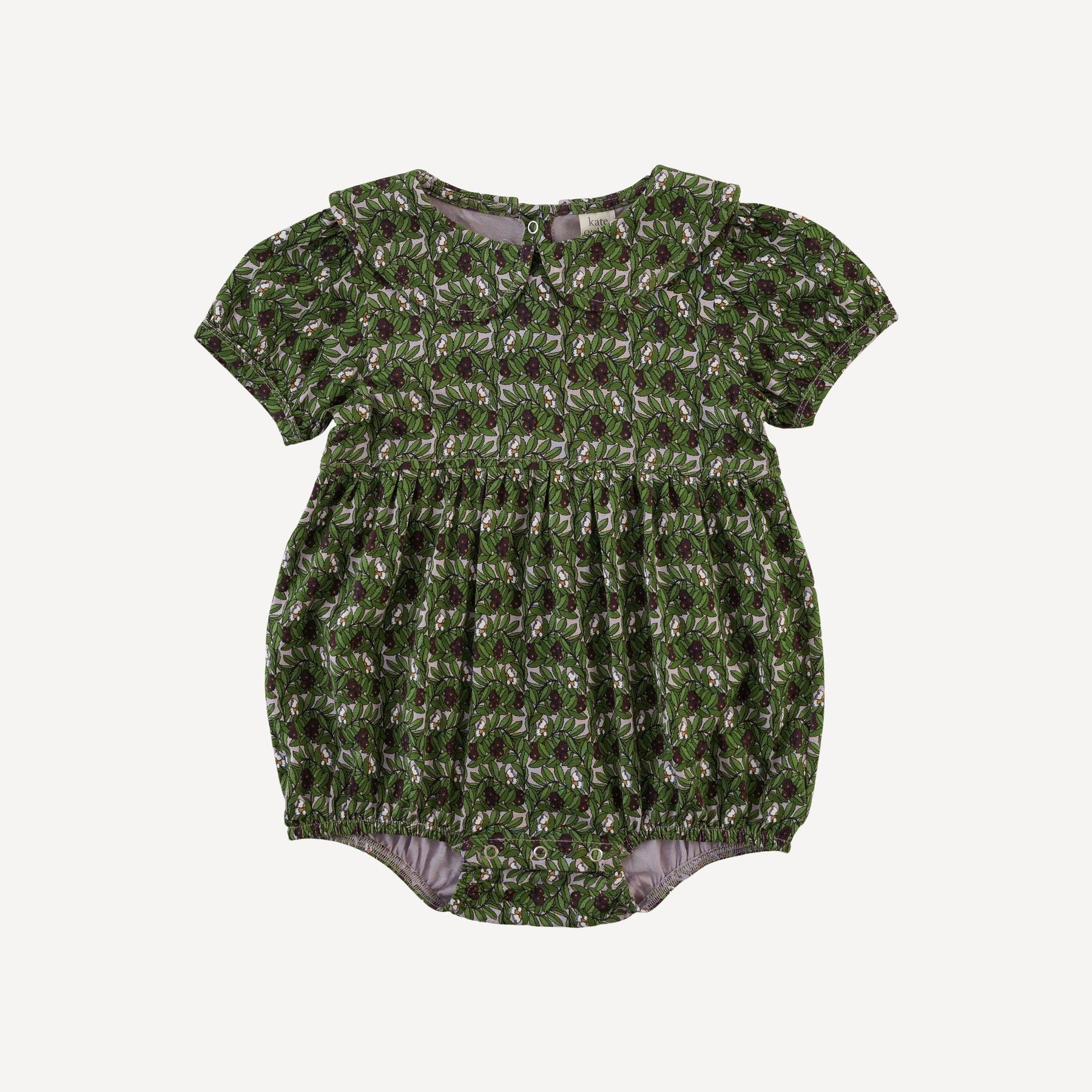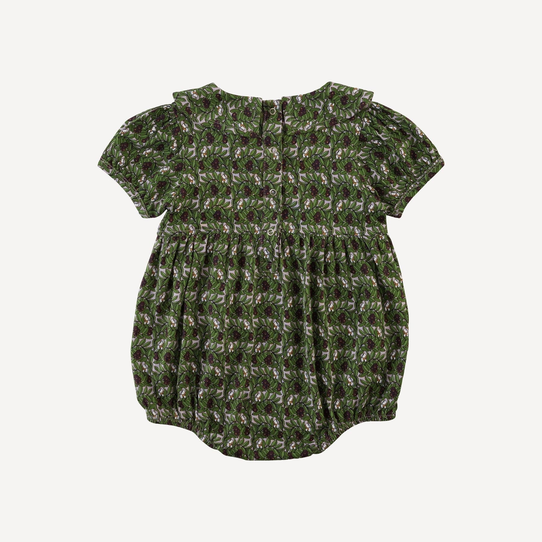Features peter pan collar, short puff sleeves, bubble body, back snap placket, and snaps in legs.