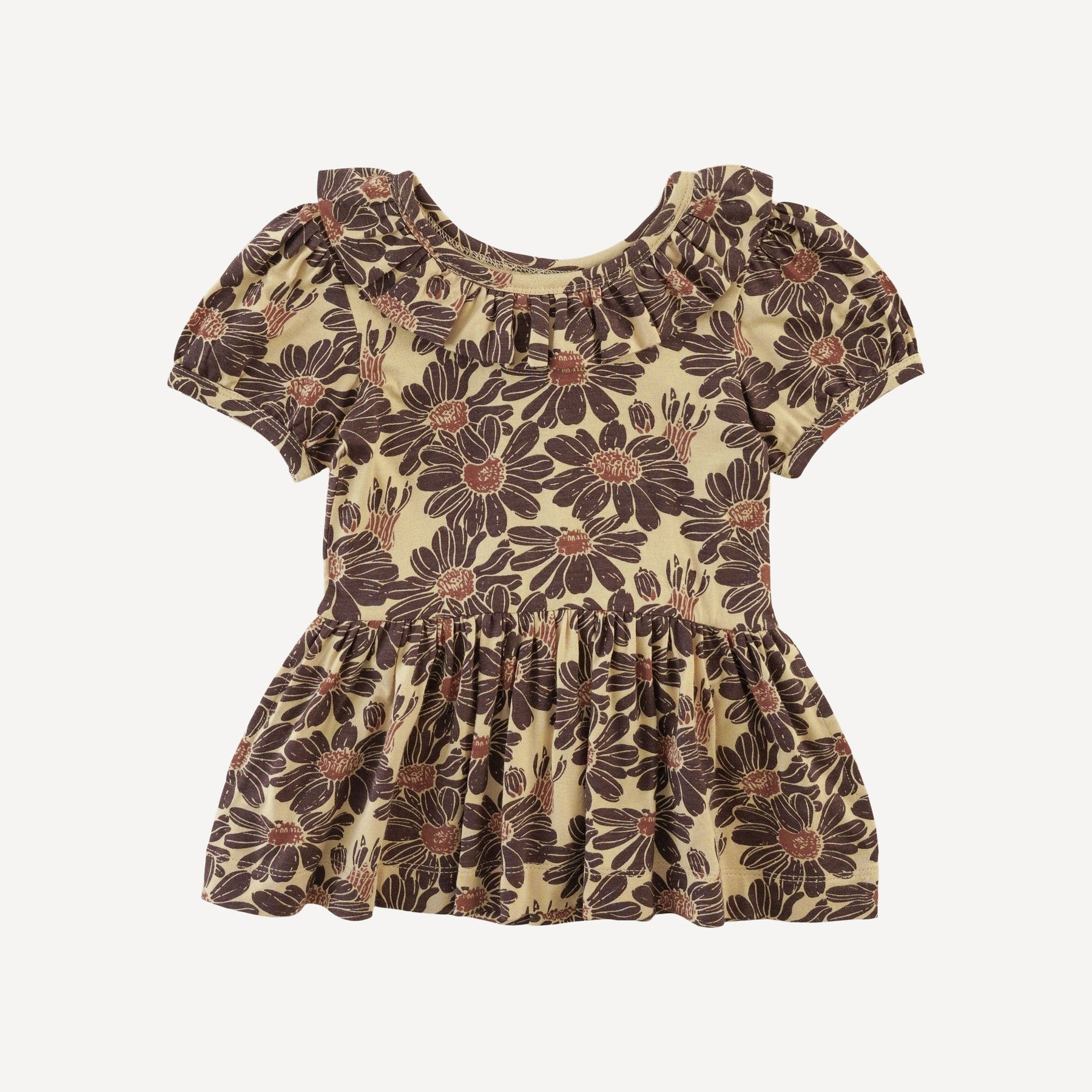 Features ruffle collar, short puff sleeves, gathered drop waist, and side seam pockets.