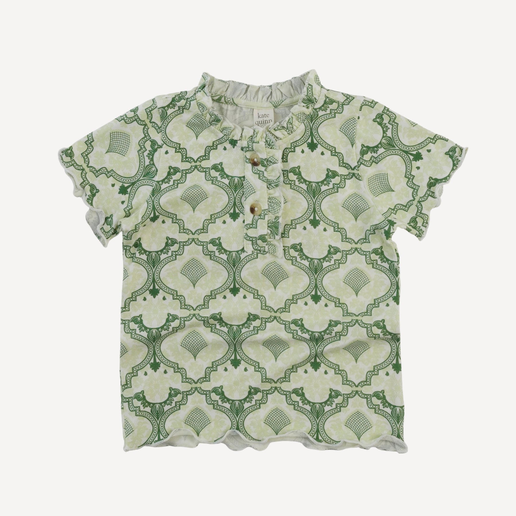 short sleeve ruffle henley tee | fog green folk floral | bamboo