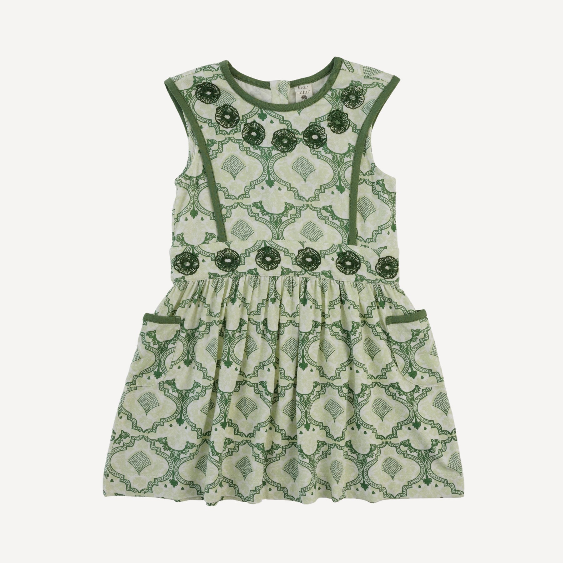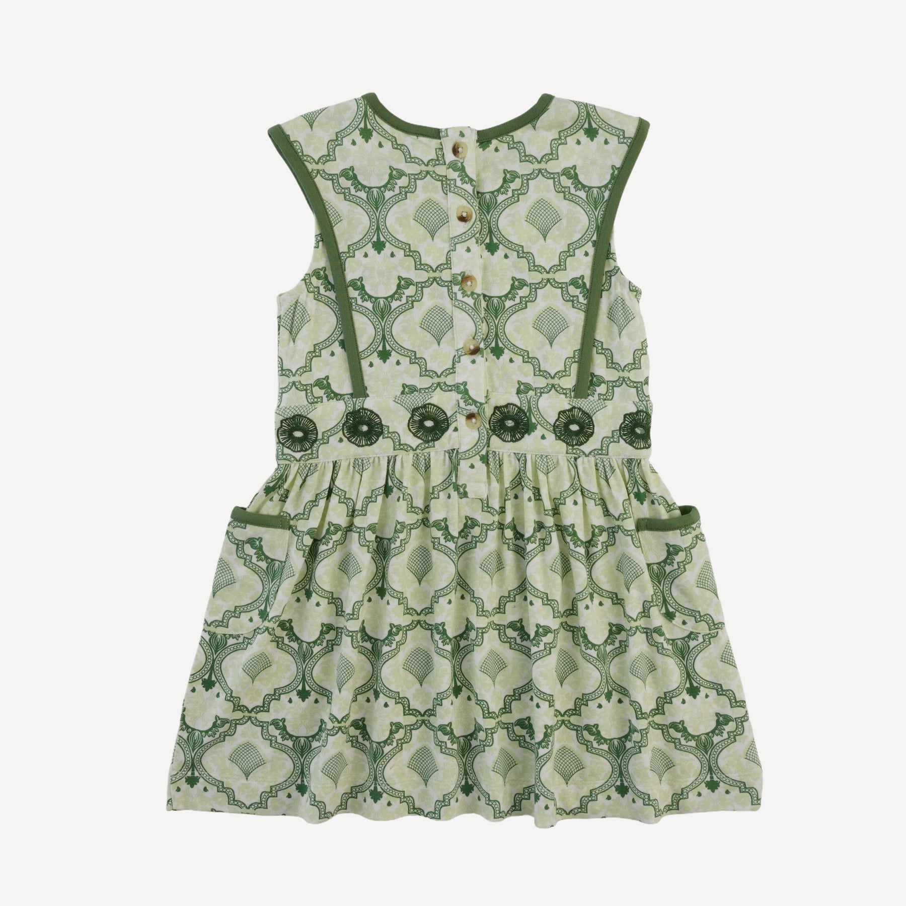 Features apron styling with contrasting binding details, embroidered details along the neckline and belted waistband, gathered details, side pockets, and back button placket.