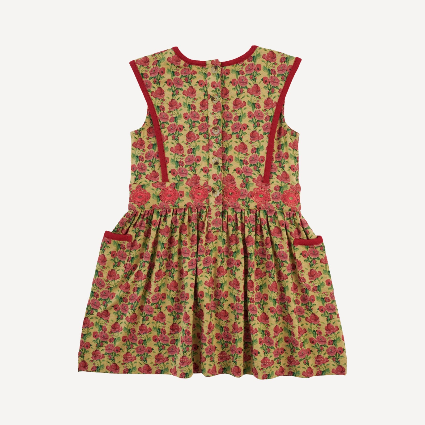 Features apron styling with contrasting binding details, embroidered details along the neckline and belted waistband, gathered details, side pockets, and back button placket.