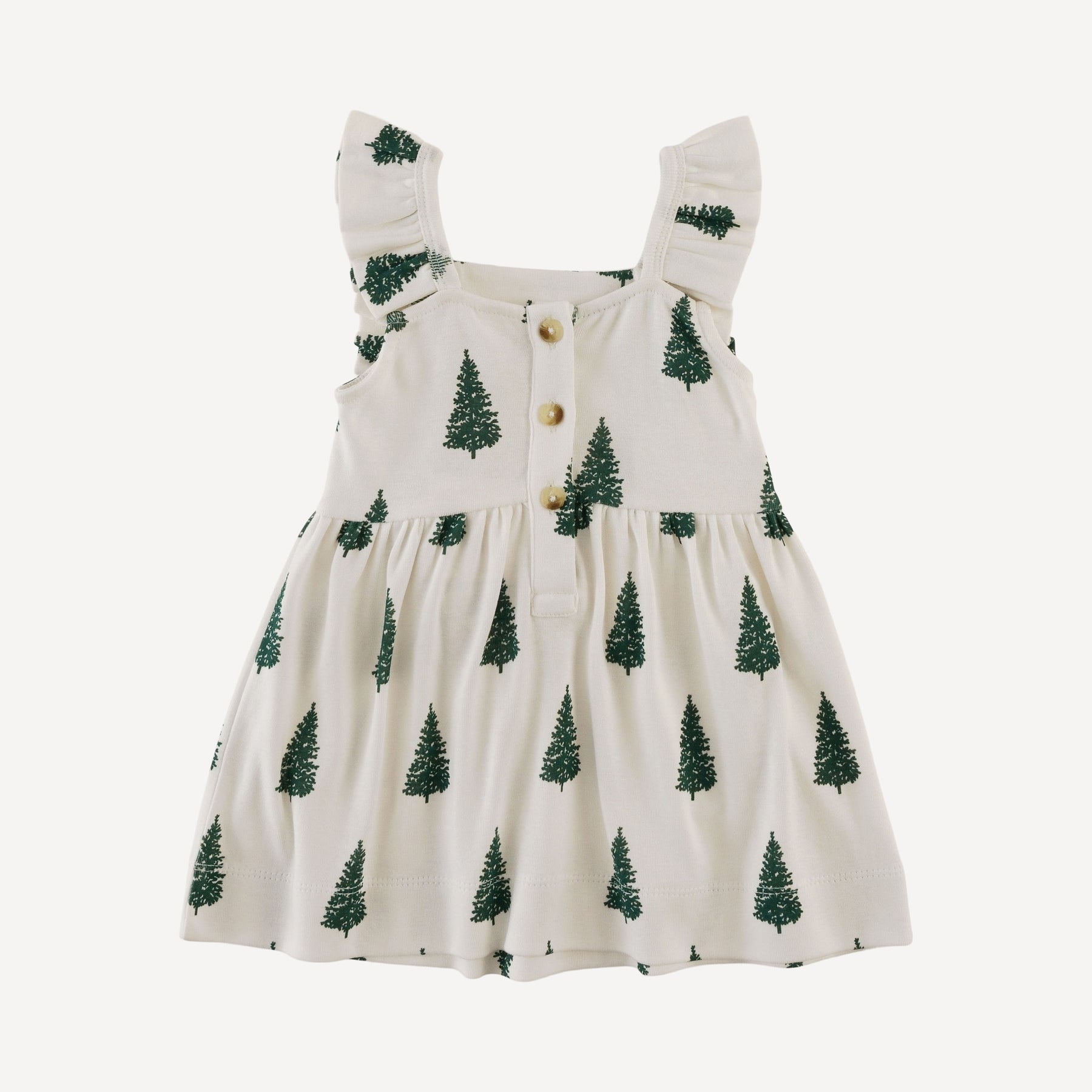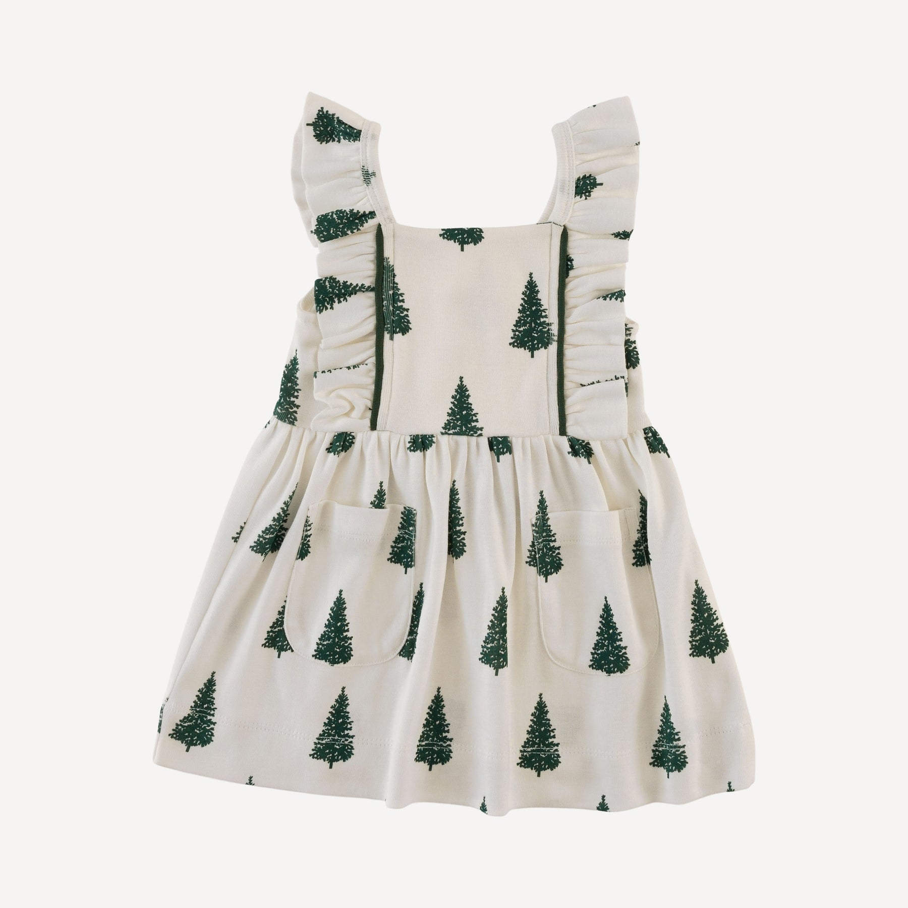 Features pinafore styling, ruffle sleeves, contrasting piping details, gathered waist, front pockets, and back button placket.