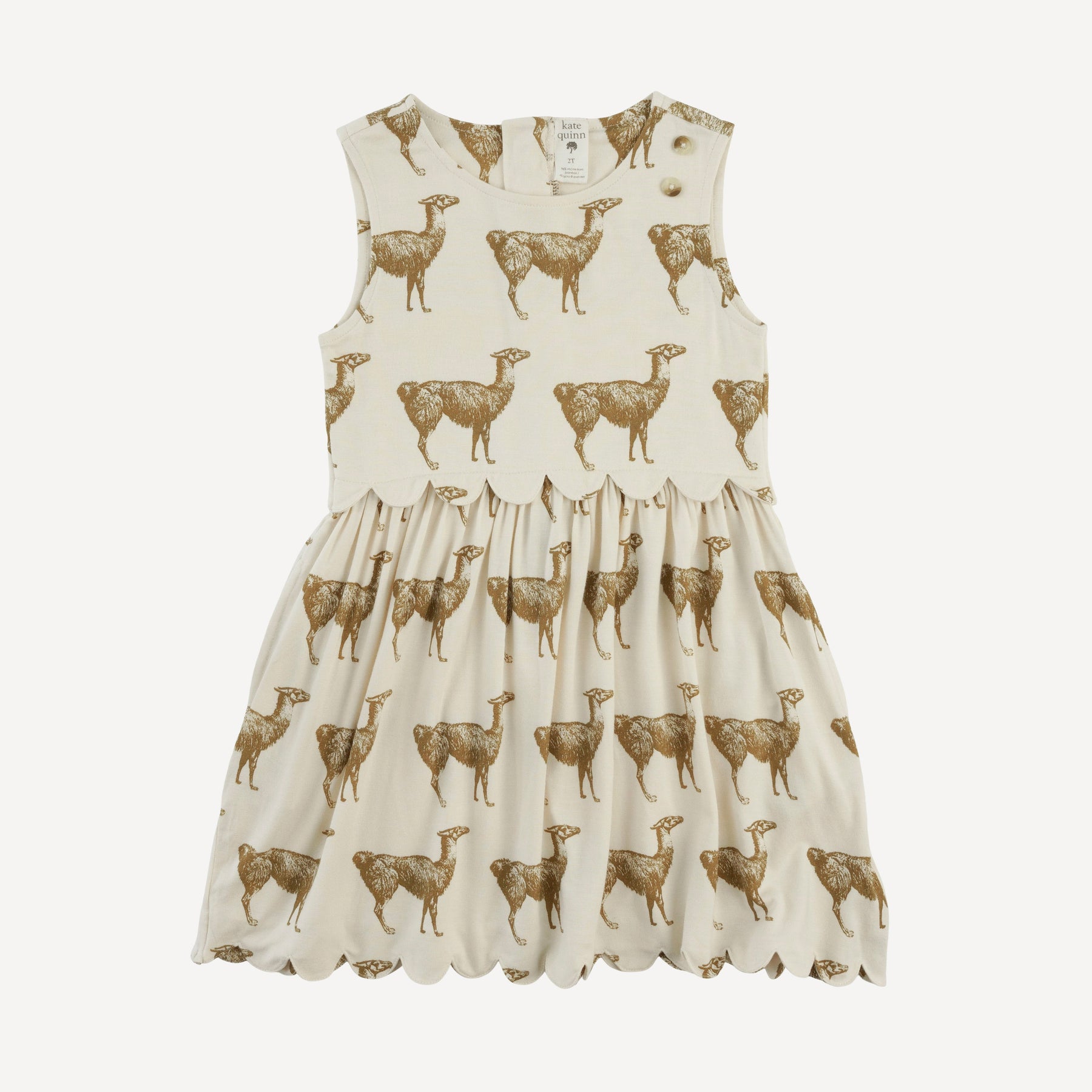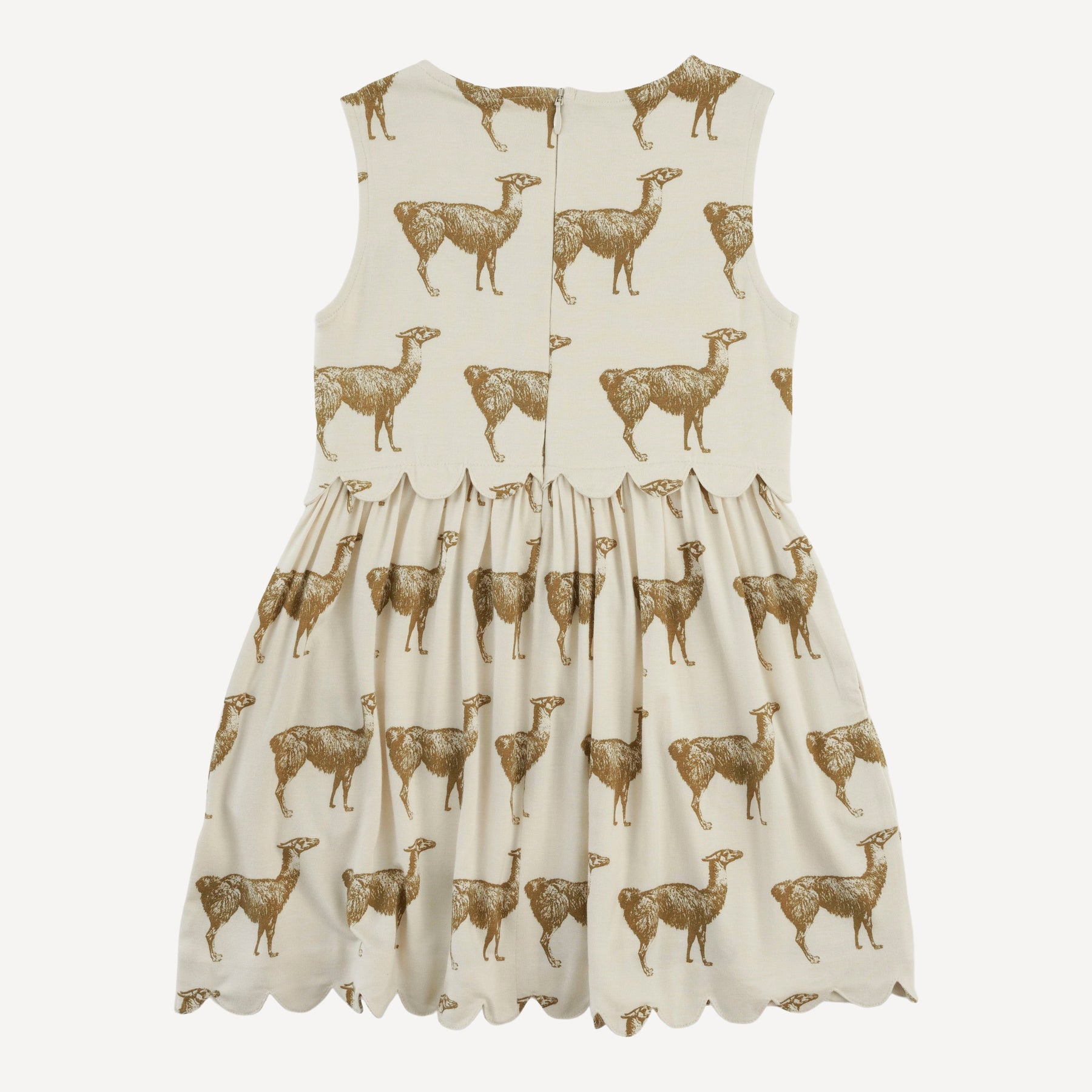 Features decorative shoulder buttons, gathered waist, side seam pockets, back zipper closure, and scallop hem at waist and skirt edge.