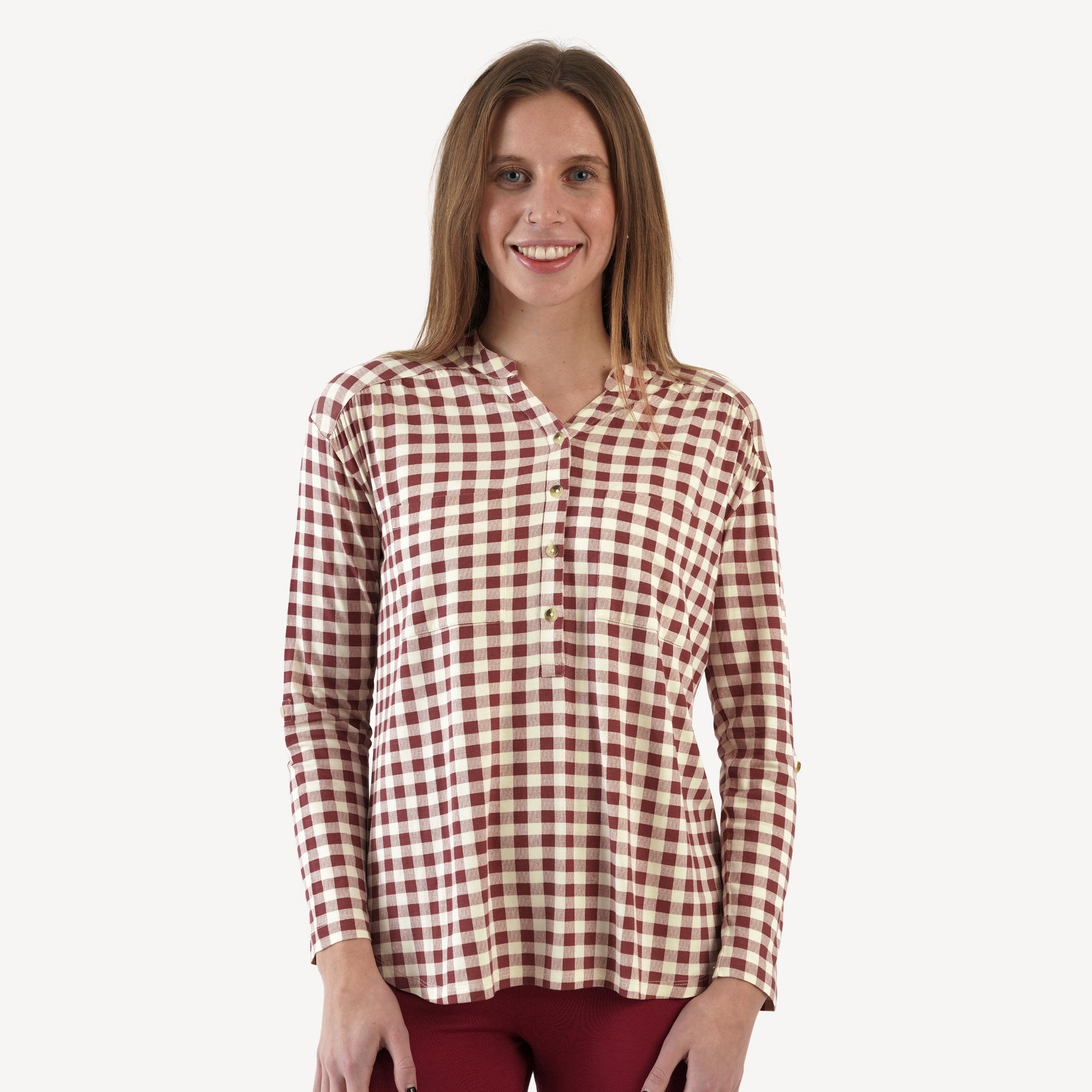 womens long sleeve gathered pocket henley tee | berry gingham | bamboo