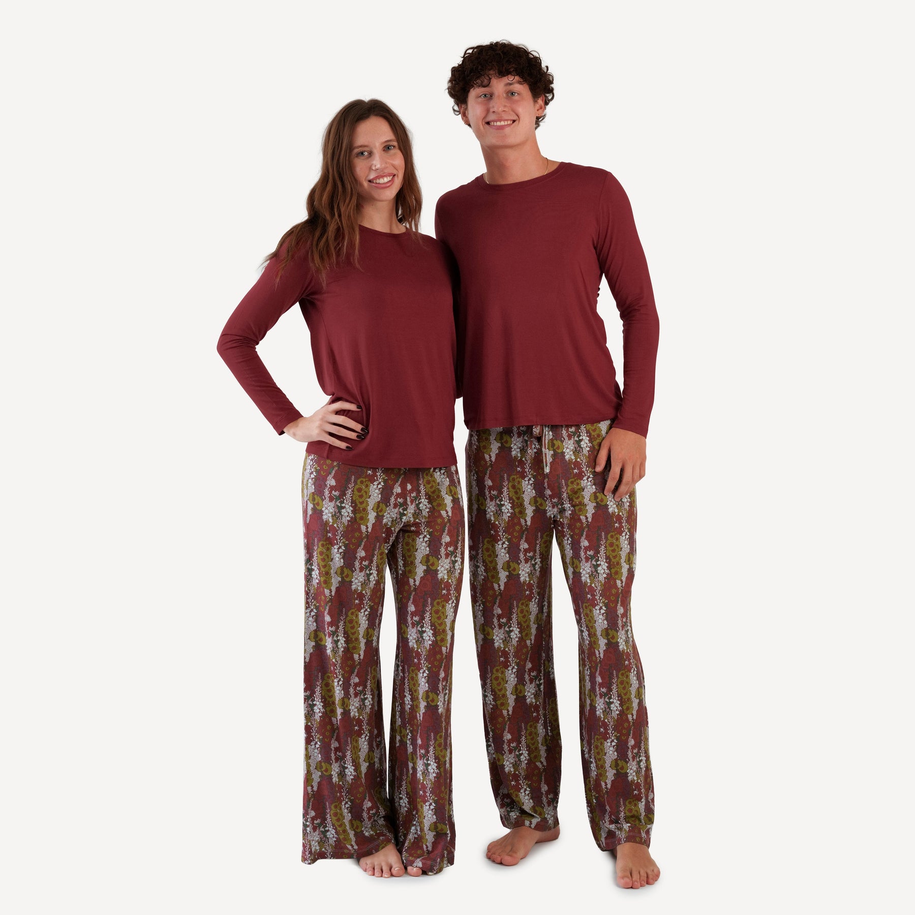 Features a crew neck top paired with contrasting pants with a drawstring elastic waistband.