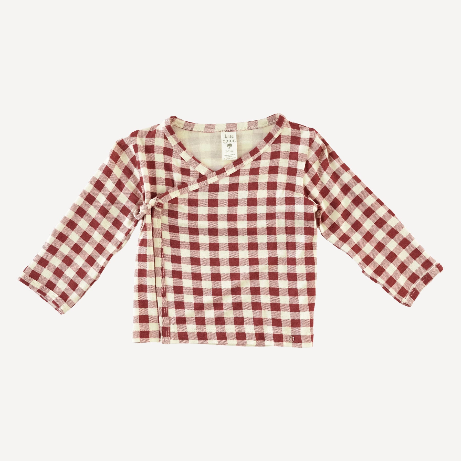 Features a wrap style top with an inner tie, side tie closure, and fold-over hand mitts paired with matching footed pants with a rollover waistband.