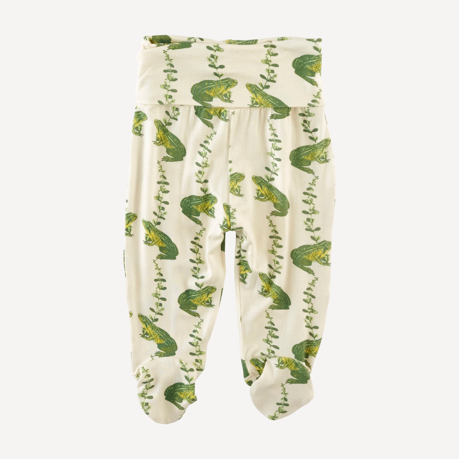 Features a wrap style top with an inner tie, side tie closure, and fold-over hand mitts paired with matching footed pants with a rollover waistband.